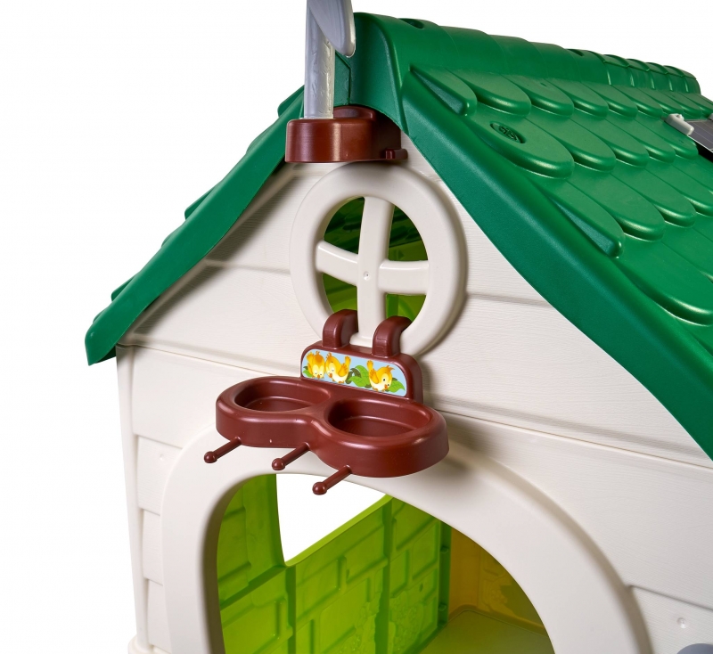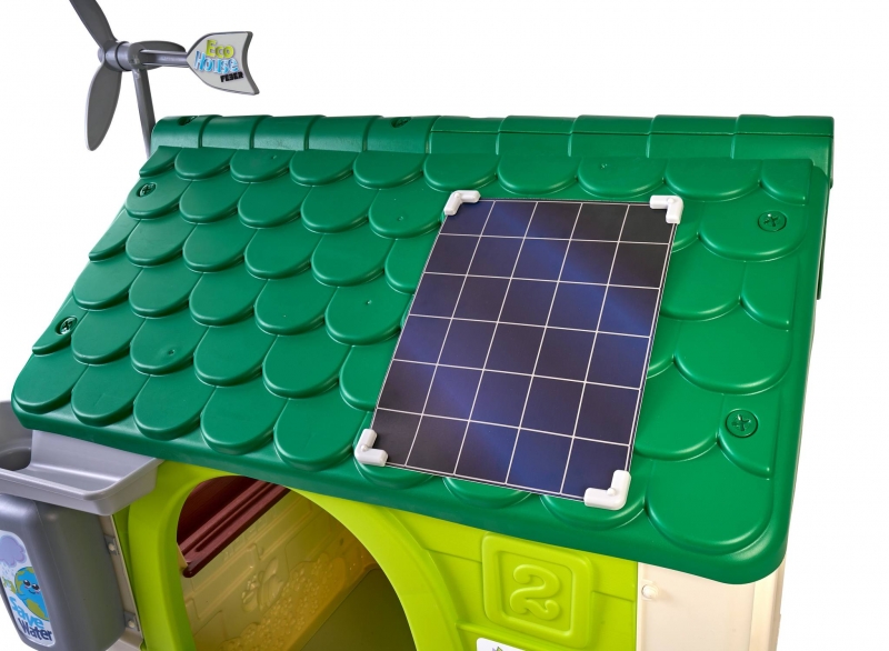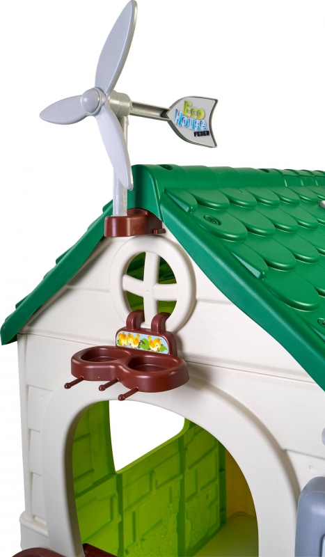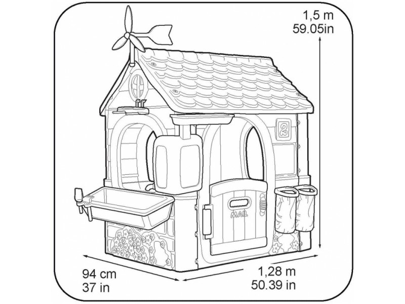 Mérete: 128x94x150 cm Doboz mérete: 110x23x87 cm Súly: 17 kg A tetőn található egy szélkerék, illetve a napelemeket imitáló panel is itt kapott helyet. A tető alatt egy madárfészek és madáretető található. A tetőről az ereszcsatornában összegyűlt vízzel lehet locsolni az elültetett virágokat. Összerakása egyszerű, rendkívül strapabíró anyagok felhasználásával készült. Könnyen tisztítható, ellenáll a napfény és az időjárás viszontagságainak, fagy és UV álló. Kültéren és beltéren is egyaránt használható. A házikó tartalma: - 2 db szelektív szemétgyűjtő - 1 db virágláda - 1 db lapát - 1 db gereblye 24 hónapos korú gyermekek használatára CE minősítéssel ellátva!