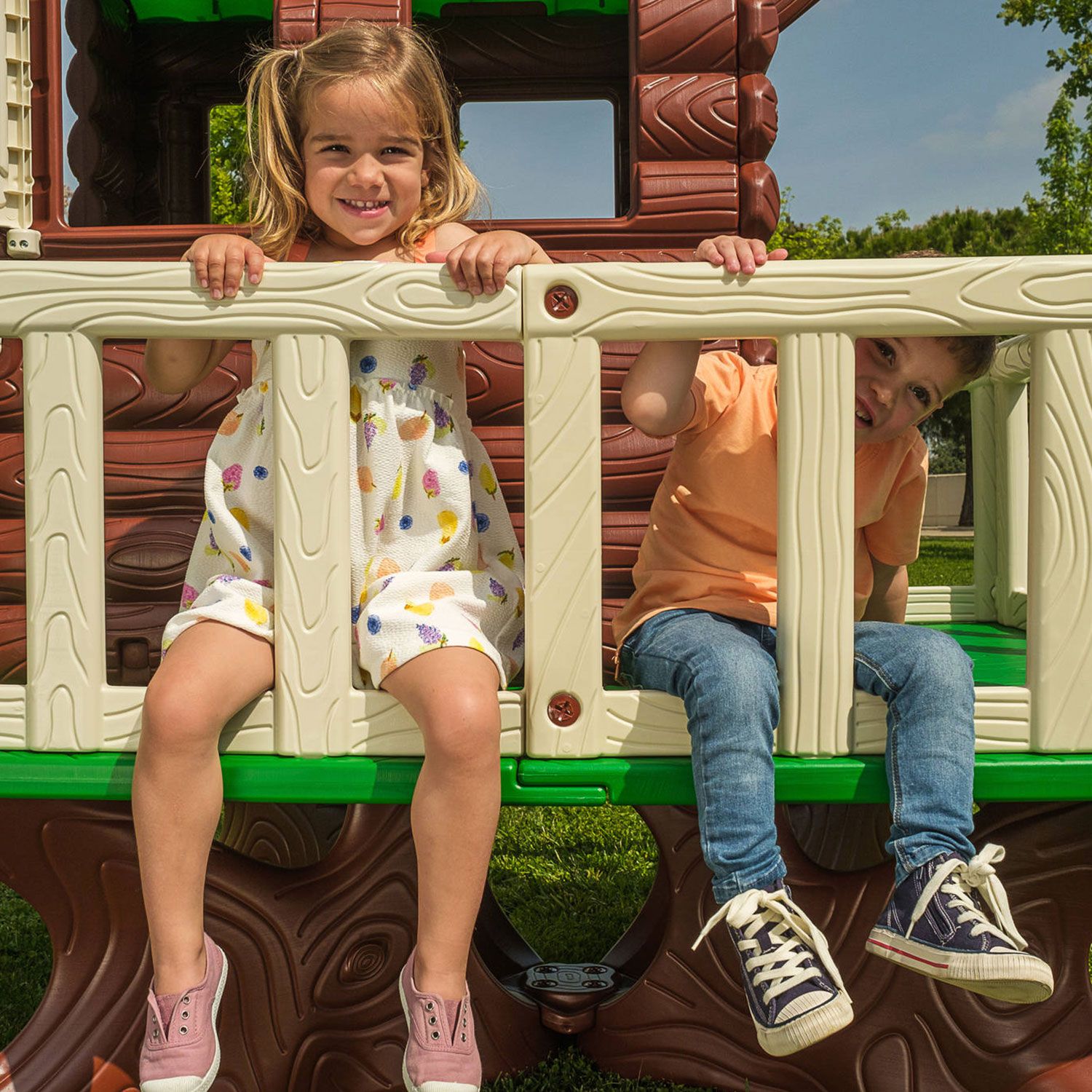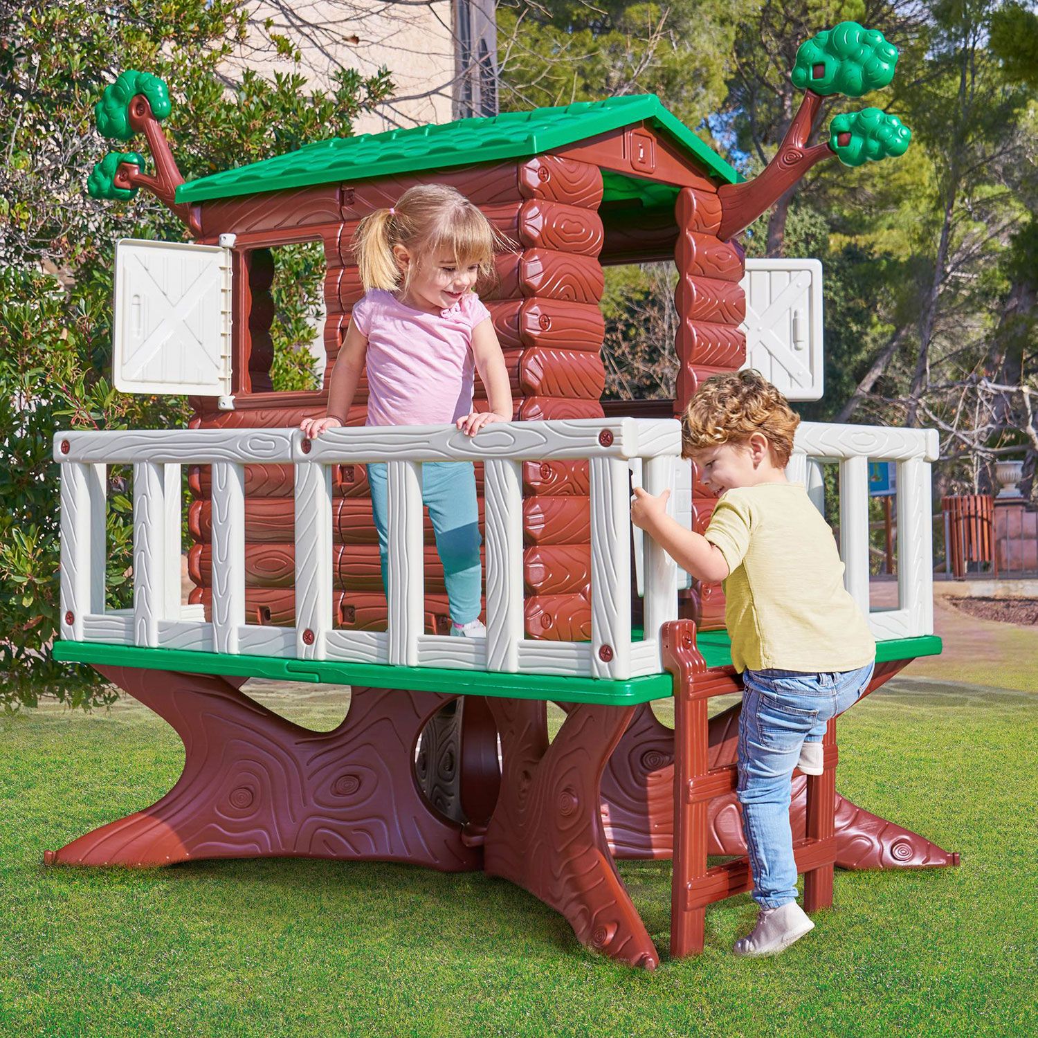 Mérete: 202x132x185 cm Doboz mérete: 198x130x188 cm Maximális teherbírása: 50 kg Súly: kb. 35 kg A kültéri játék igazán egyedi megjelenéssel rendelkezik, hiszen egy fa tetején lévő faházikót ábrázol. A játék élénk barna, zöld és krém színei igazán természetessé teszik a külsejét. A házikóba való bejutáshoz 2-3 létrafokot kell megmászni, emiatt 3 éves kor alatt nem ajánlott a használata! A házikó körül korlát található, így téve biztonságossá a játékot. A játék strapabíró, UV álló műanyagból készült, ezáltal nem fakul ki még a napsütésben sem. A valósághű megjelenést erősítik a nyitható és csukható nyílászárók, úgy mint ajtó és ablakok.