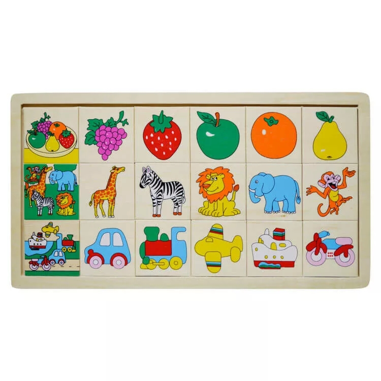 A színes fa kirakó segít a gyerekeknek fejleszteni a memóriájukat, koncentrációjukat és a felismerő képességüket. A lényege a játéknak, hogy a gyerekeknek a sor elején látható ábra részeit kell megkeresni, és a helyükre tenni. Miközben szórakoztat, segít a színek, gyümölcsök, vadállatok és járművek neveinek elsajátításában, mindezt játékos módon. Egy remek eszköz a tanulás és szórakozás egyesítésére!