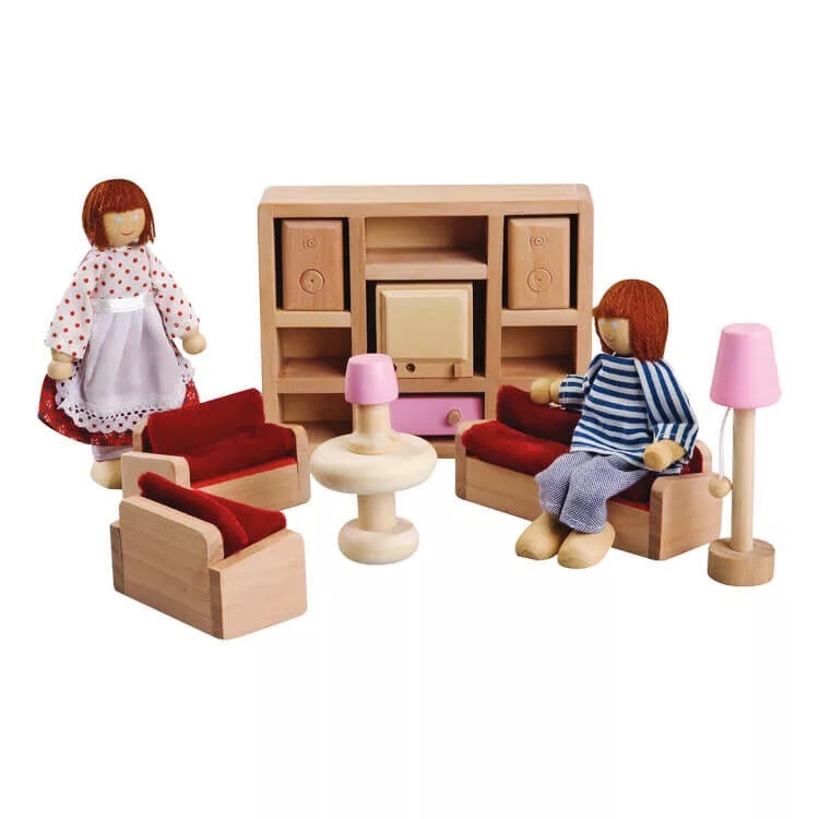 Kiváló minőségű, környezetbarát anyagból készült játék nappali bababútor szerepjátékhoz natúr fa, pasztell rózsaszín és piros színekben. A szett tartalma többek között két fotel, egy kanapé, nappali bútor, állólámpa, kisasztal. A doboz nem tartalmazza a babákat!