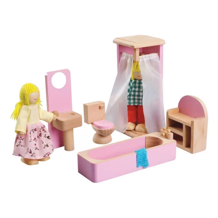 Kiváló minőségű, környezetbarát anyagból készült játék gyerekszoba bababútor szerepjátékhoz natúr fa és pasztell színekben. A szett tartalma többek kád, mosdókagyló tükörrel, wc, fürdőszobai szekrény, zuhanykabin függönnyel. A doboz nem tartalmazza a babákat!