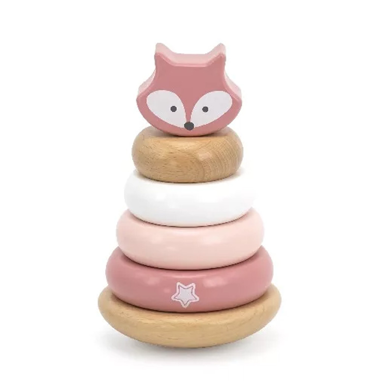 Bájos, pasztell rózsaszín Montesszori torony játék kedves róka figurával a tetején.
