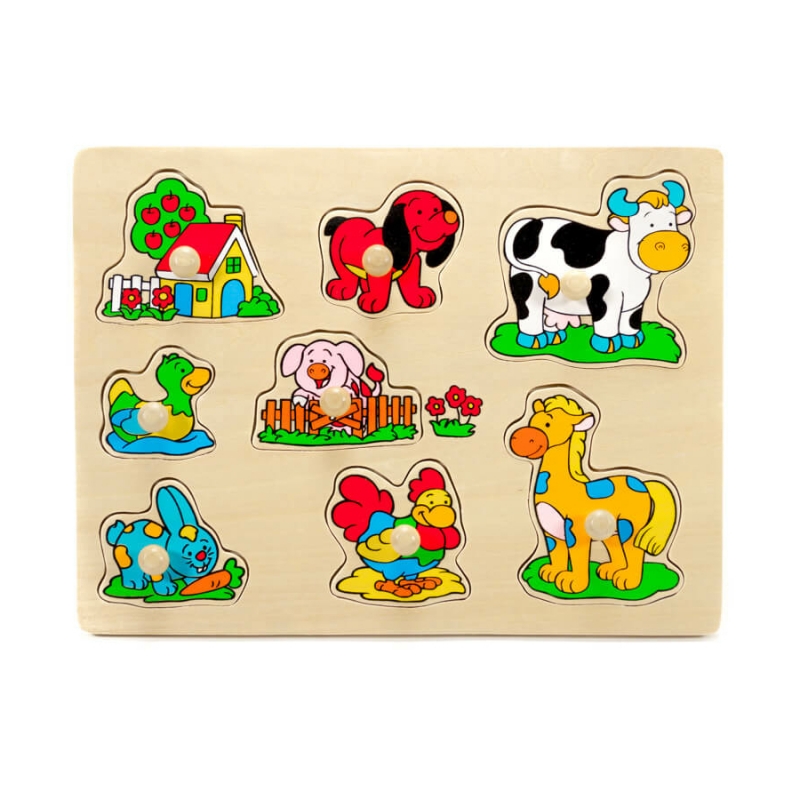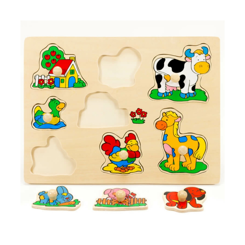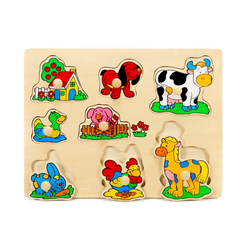 A farm tematikájú fogantyús puzzle vidám színekkel ösztönzi a gyerekeket a játékra, amely a játék örömén túl számos készség fejlesztésére is alkalmas.