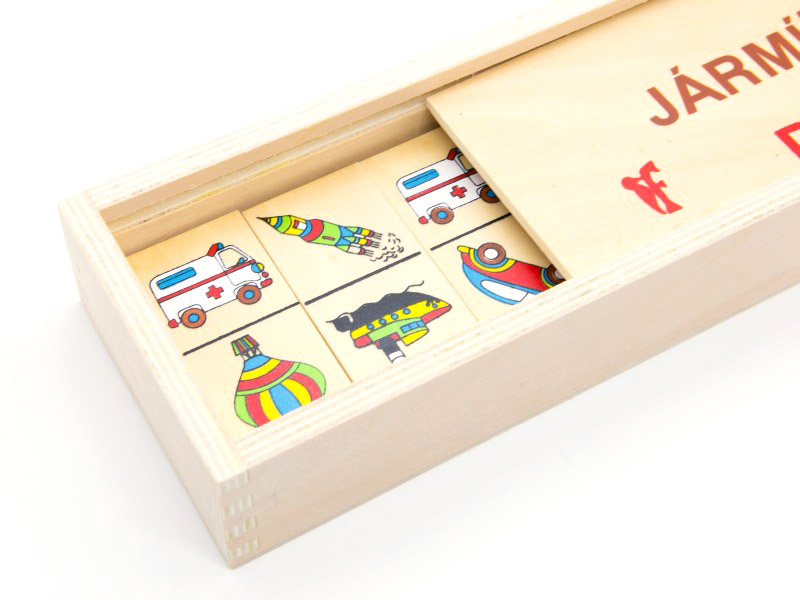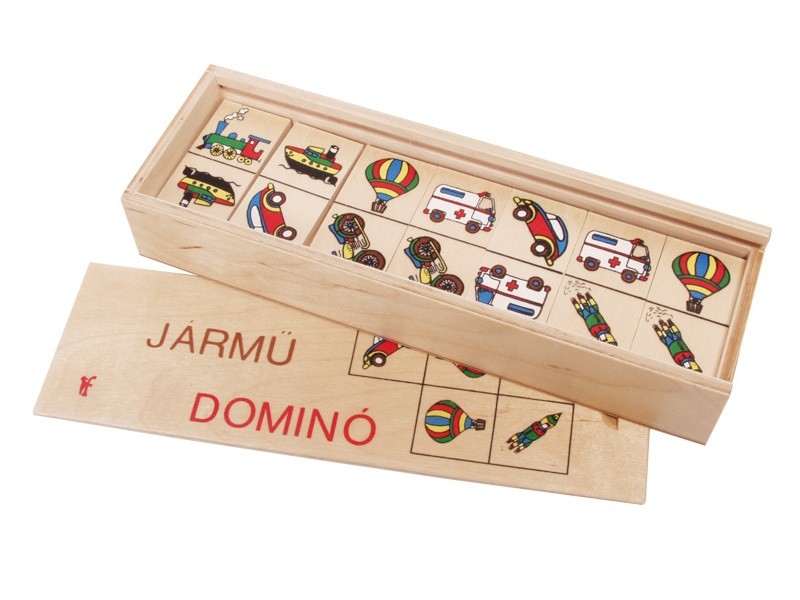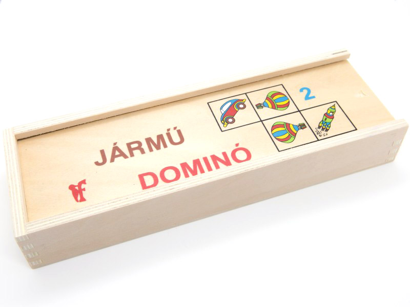 A fából készült járműves dominó 28 lapocskából áll. A színes képek esztétikussá, kemény fa anyaga strapabíróvá teszi a játékot. Játékosok száma: 2-5 fő A doboz mérete: 27x9x4 cm