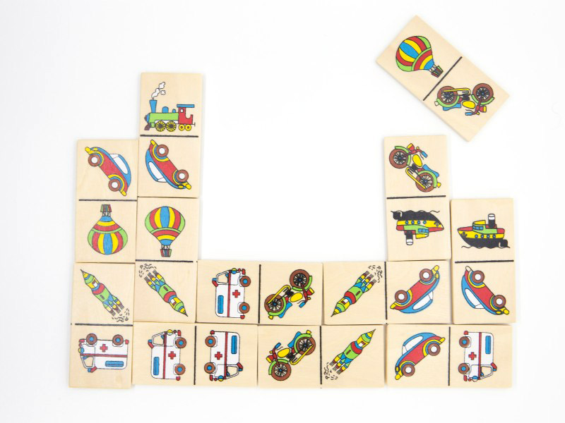 A járműves fa dominó készlet nem pöttyös dominókat tartalmaz, hanem közlekedési eszközöket, így amellett, hogy a formafelismerés képessége hangsúlyt kap a játék során, a szókincs bővülését is elősegíti a gyermek számára.