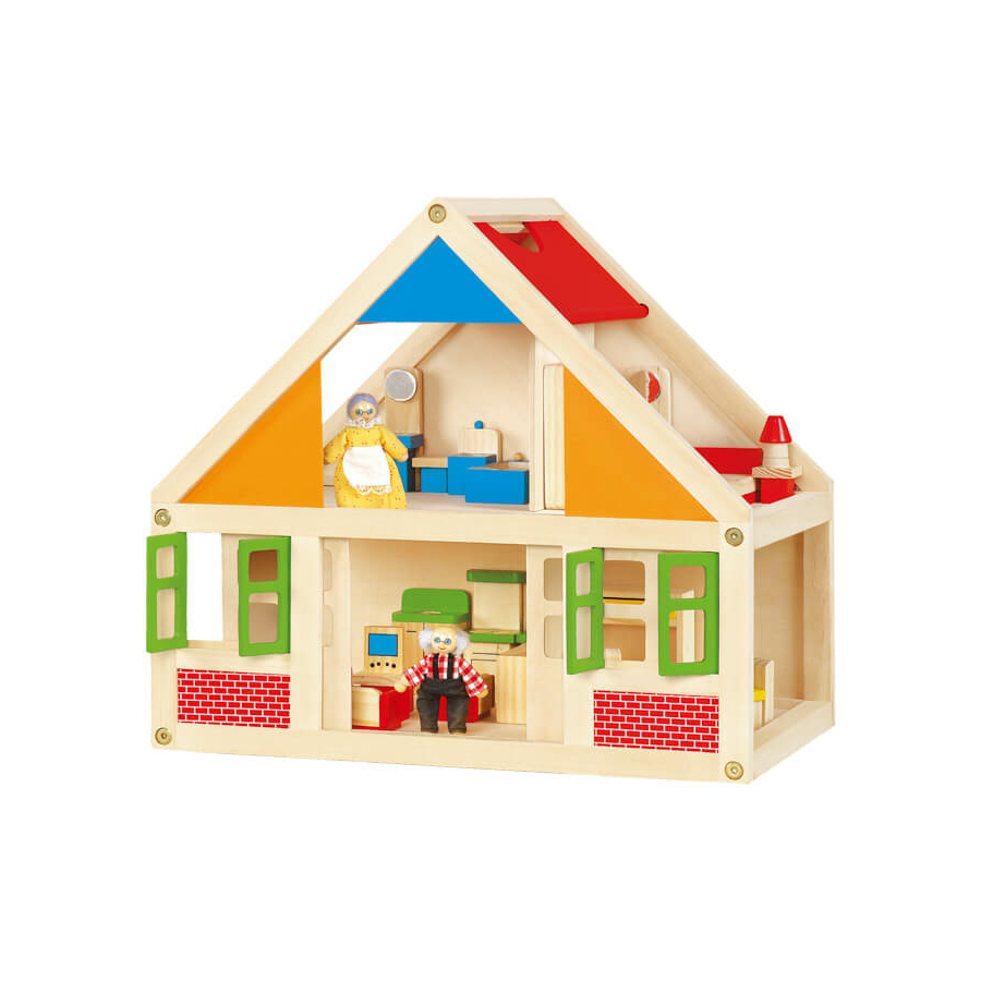 A babaház a szerepjátékok nélkülözhetetlen játékeszköze. A házikó kétszintes, a jellemző szobatípusokat mind tartalmazza. A földszinten konyha és nappali, az emeleten fürdő- és hálószoba kapott helyet. A készletben továbbá található két kis figura is, a nagymama és a nagypapa. A bútorok mind kivehetőek, áthelyezhetőek. Mérete: 42x40x26 cm