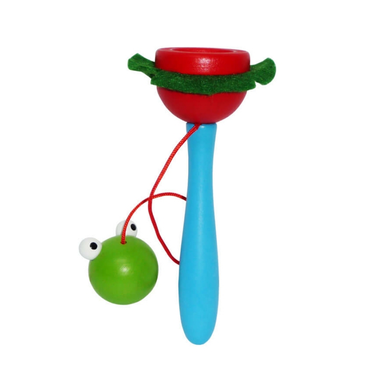 A kis békás golyós játék igazi koncentráció és ügyességfejlesztő játék. A játék egy kék színű nyélből egy piros és zöld színű tálka szerű felsőrészből és egy zsinóron lógó kisbékás golyóból áll. A cél, hogy a béka beleugorjon a piros virágba, mindezt úgy hogy csak a nyelet foghatjuk. Mérete: 4x4x15 cm