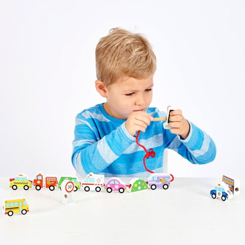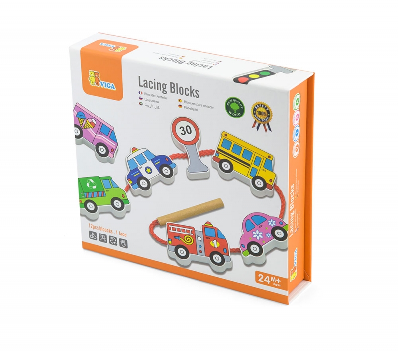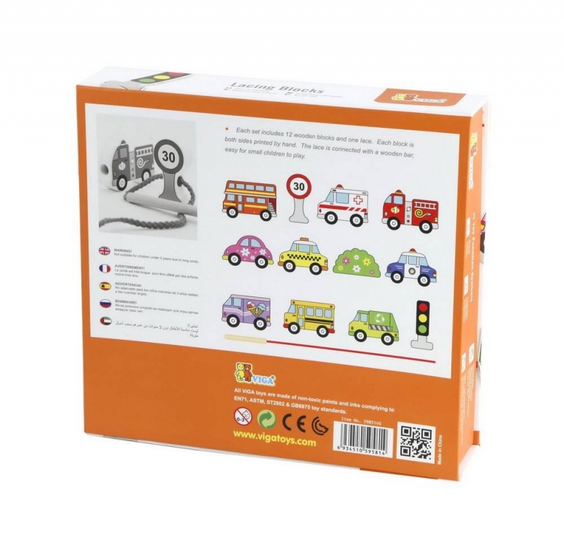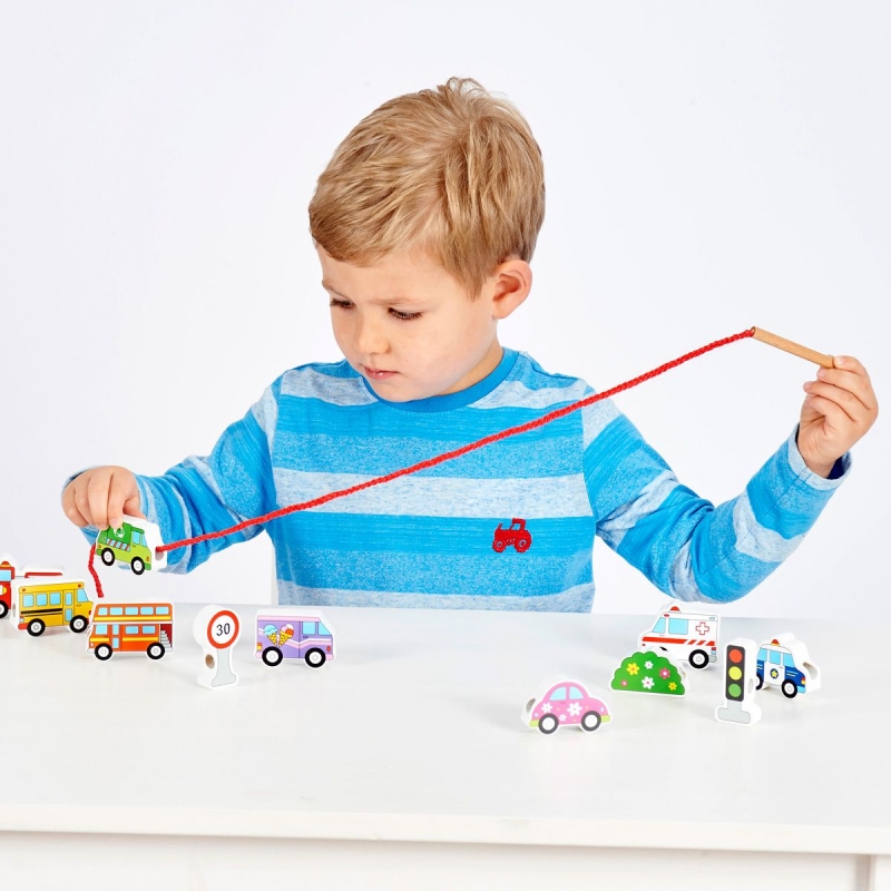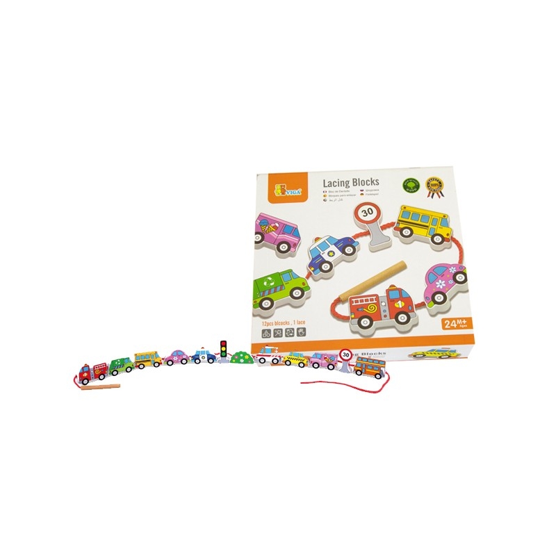 Fából készült fűzhető játék járműves formákkal. A játék fejleszti a finommotorikát, a szem-kéz koordinációt és a kreativitást. A doboz mérete: 22x16x3 cm Tartalom: 12 darab felfűzhető jármű forma