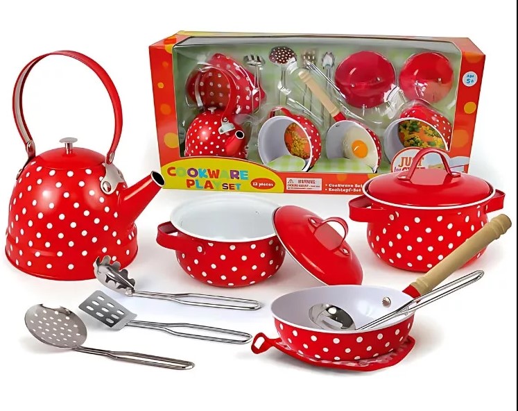 Ez a klasszikus pöttyös edénykészlet nemcsak dísze lesz a játékkonyhának, hanem hosszan tartó, fejlesztő élményt is nyújt a kis mesterszakácsoknak.