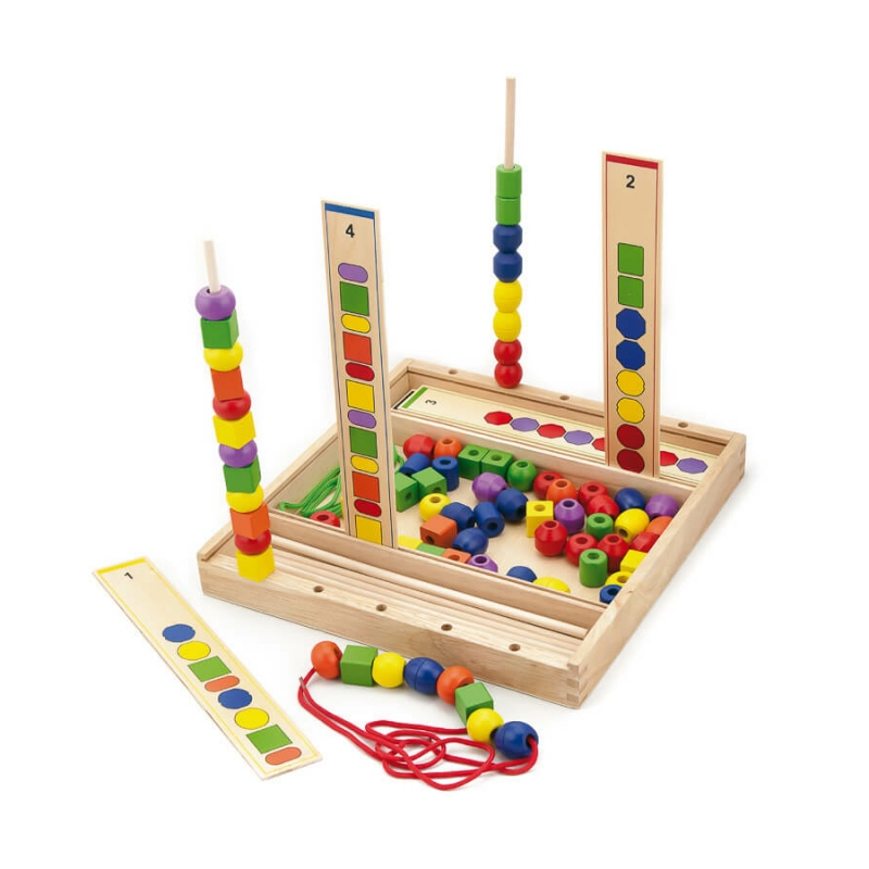 A logikai toronyépítő játékkal különböző feladatkártyák alapján lehet a készlet színes gyöngyeit vagy toronynak megépíteni, vagy egy textil zsinórra felfűzni. A játék elemei egy fa dobozkában érkeznek, ami tárolódobozként is funkcionálhat. A készletben 6 különböző színben és formában találhatóak meg a gyöngyök. Ez a citrom- és narancssárga, a piros, a lila, a zöld és a kék. A szett további elemei a 10 különböző, fából készült feladatkártya, a tornyok építését segítő rudak és a fűzőfonál. Mérete: 33,5x33x4 cm