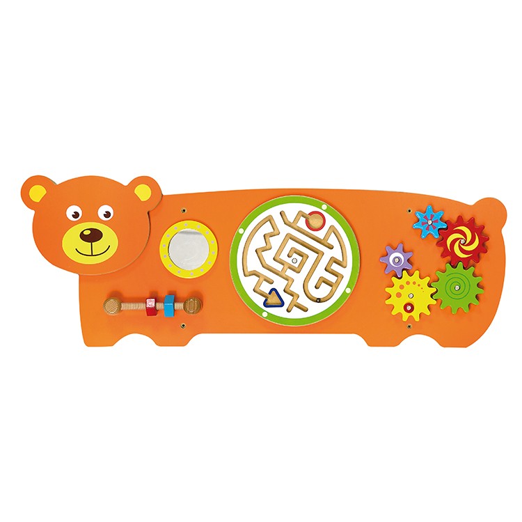A falra szerelhető macis logikai fali játék az egészen kis óvodásoktól kezdve nyújtanak izgalmas felfedezést a gyerekek számára. A játék alapja egy barna színű lap, amelyen labirintus, fogaskerekek, vonalvezető található. A termék mérete: 91x32x6 cm
