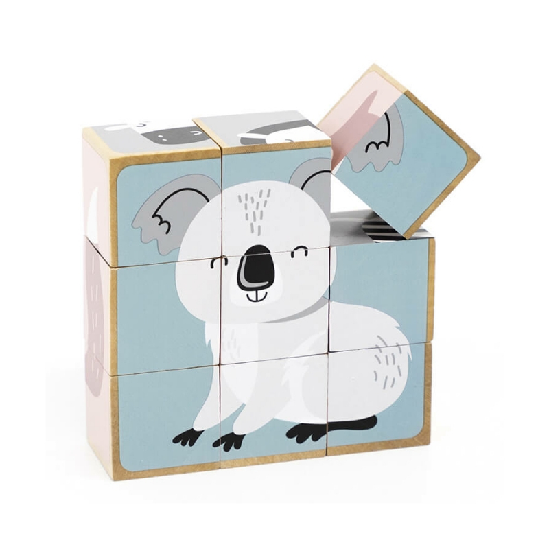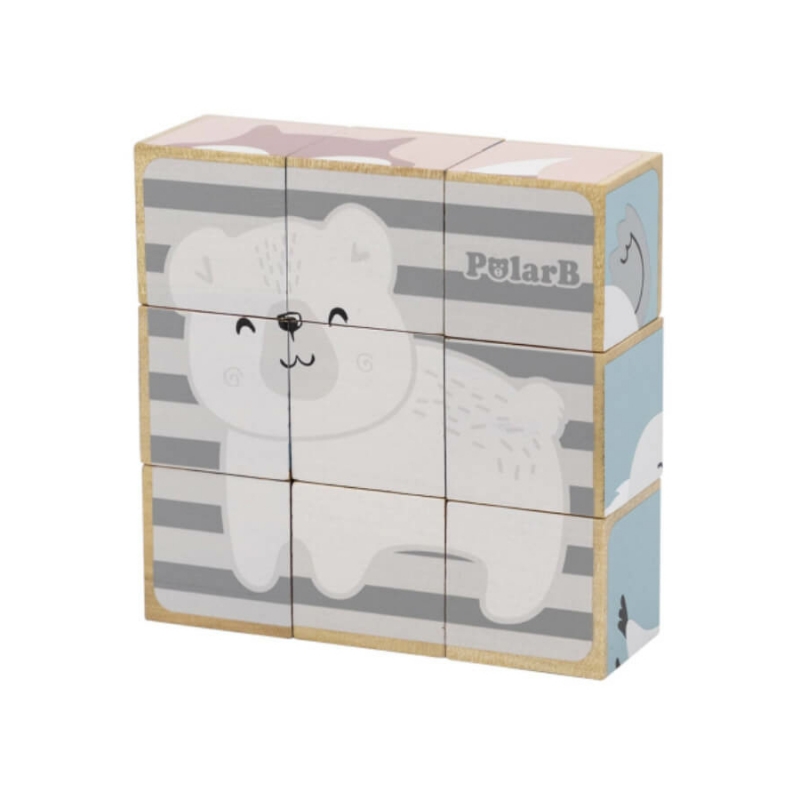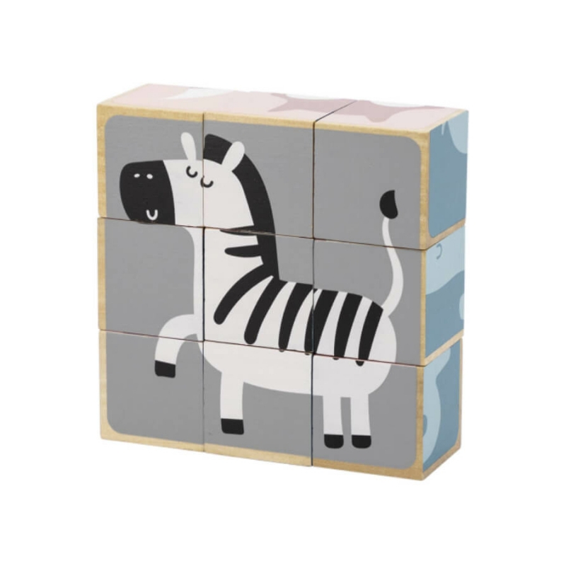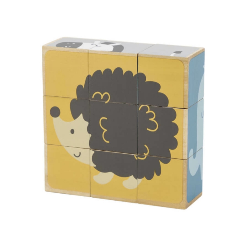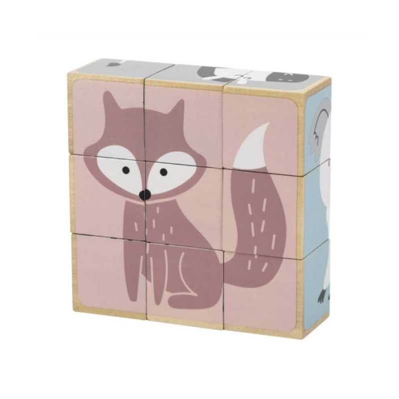 Az állatos mesekockákból 6 db kedves kis állatka, pasztell árnyalatokból álló képe rakható ki. A képek közt megtalálható a róka, a zebra, a koala, a jegesmedve, a süni és az elefánt. A kockák megfelelő forgatásával találhatjuk meg az összeillő részeket. A kockák egy praktikus fa dobozban érkeznek, amely a későbbi tárolásban is segítségünkre lehet. Készlet tartalma: 9 db kocka 24 hónapos korú gyermekek használatára CE minősítéssel ellátva! Mérete: 14x14x5 cm