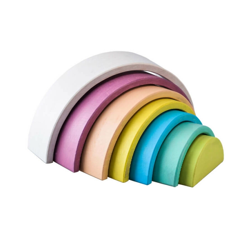 A 7 db-os szivárványos építőszett, különböző méretű és színű félköríves elemből áll.