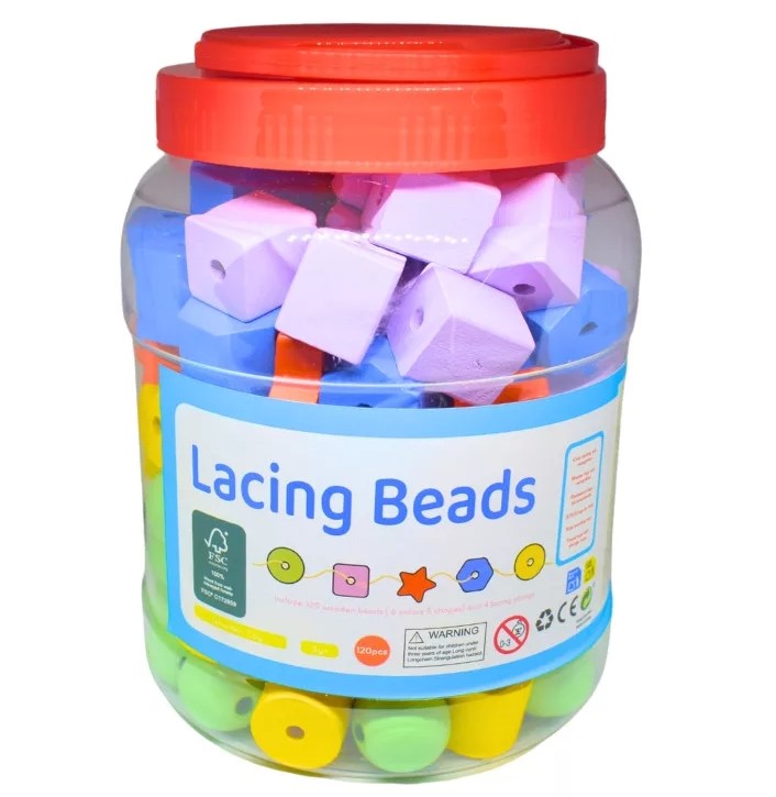 120 darabos fűző szett élénk színű, különböző formájú fagyöngyöket és vastag fűzőzsinórokat tartalmaz, hogy a gyerekek saját ékszereket, kígyókat vagy egyszerű színsorozatokat készíthessenek. A simára csiszolt, gyermekbarát festékkel kezelt faelemek biztonságosan megfoghatók, a zsinórok keményített végűek, így a befűzés könnyen megy már óvodás kézzel is.
