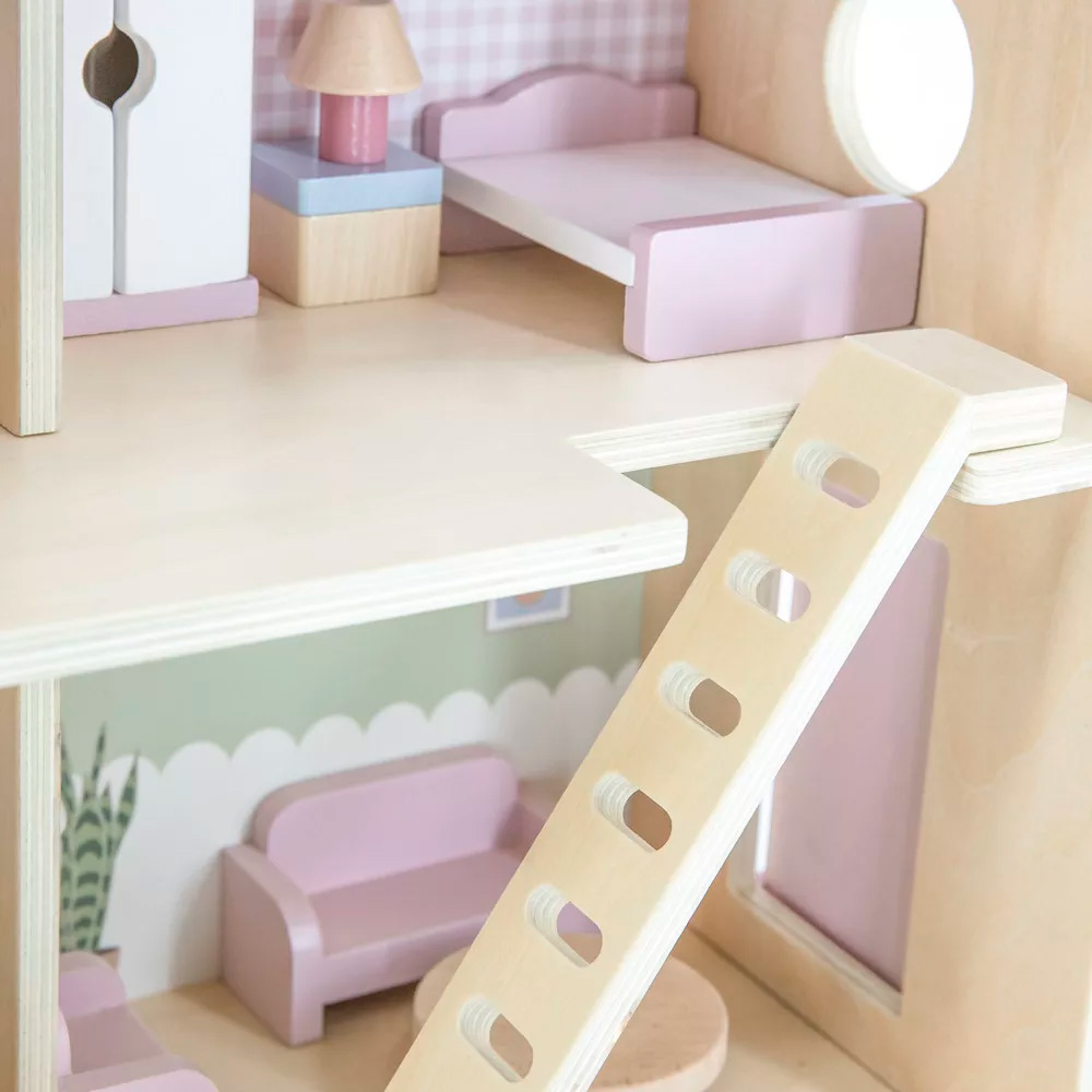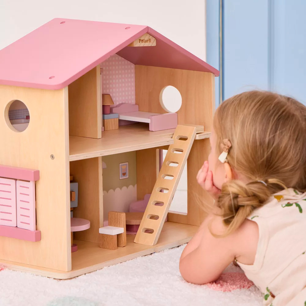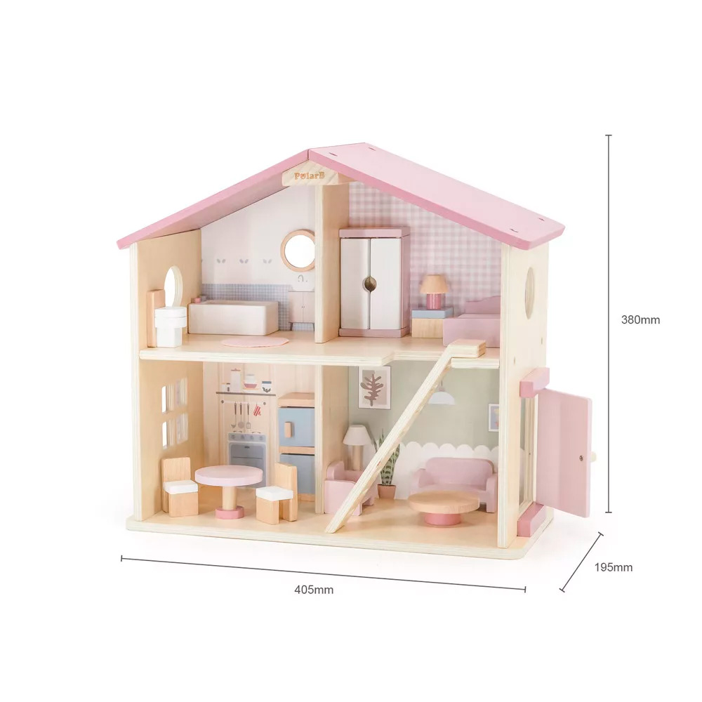 Ez a kis, fából készült babaház tökéletes választás 3 éves kor felett, akik élvezik a szerepjátékokat. A ház minden helyiséges apró bútorokkal van ellátva, és segít a gyerekeknek fejleszteni a kézügyességüket, képzelőerejüket, a nyelvi készségeiket, valamint a társas kapcsolatok kiépítését. A szép pasztell színek még vonzóbbá teszik a játékot, míg a tartós fa anyag hosszú távú használatot biztosít. A babaház remek ajándék, amely szórakoztat és tanít egyszerre.