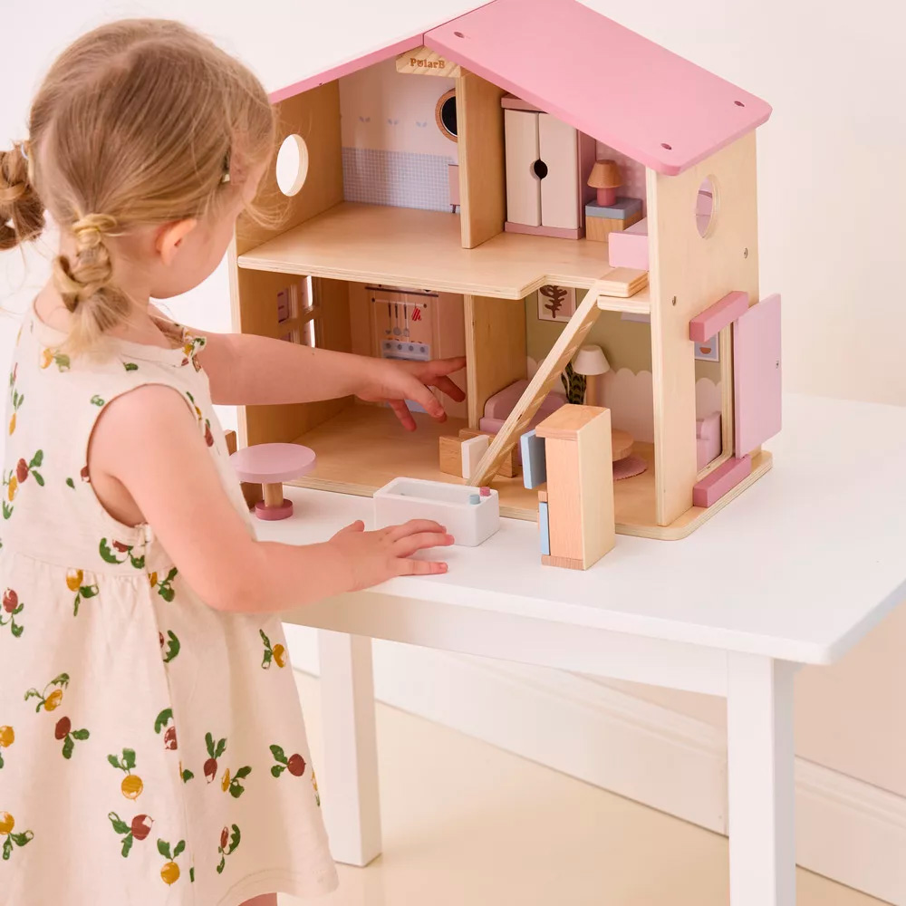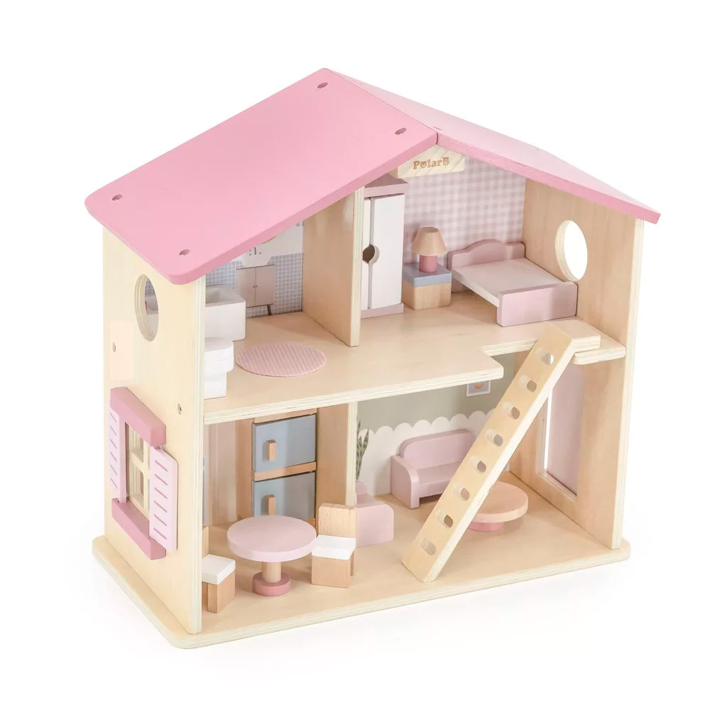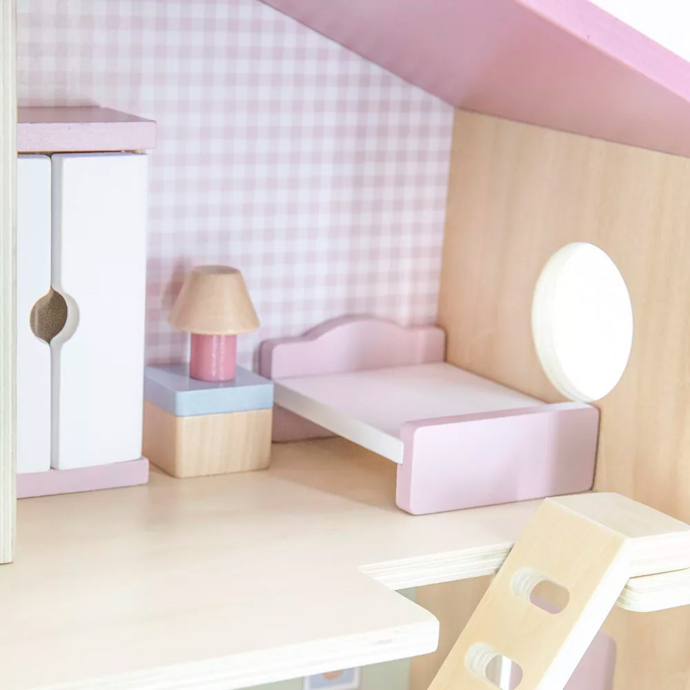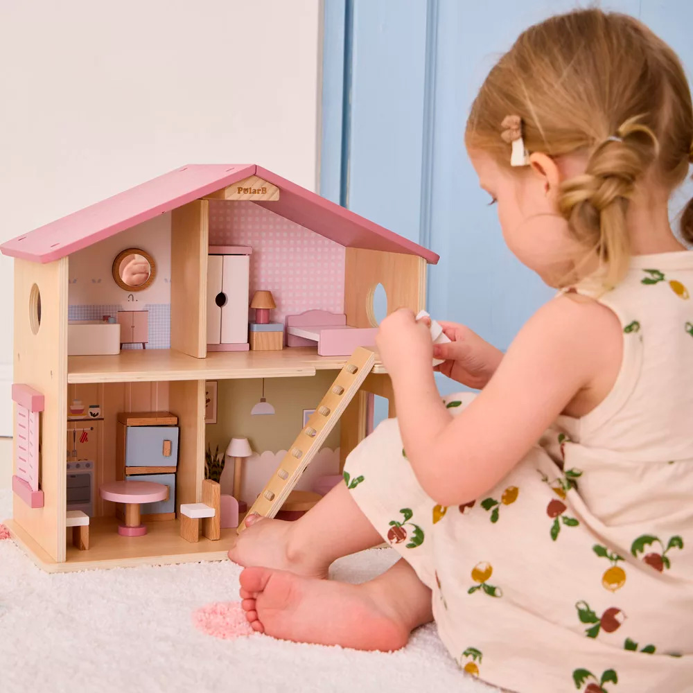 Ez a kis, fából készült babaház tökéletes választás 3 éves kor felett, akik élvezik a szerepjátékokat. A ház minden helyiséges apró bútorokkal van ellátva, és segít a gyerekeknek fejleszteni a kézügyességüket, képzelőerejüket, a nyelvi készségeiket, valamint a társas kapcsolatok kiépítését. A szép pasztell színek még vonzóbbá teszik a játékot, míg a tartós fa anyag hosszú távú használatot biztosít. A babaház remek ajándék, amely szórakoztat és tanít egyszerre.