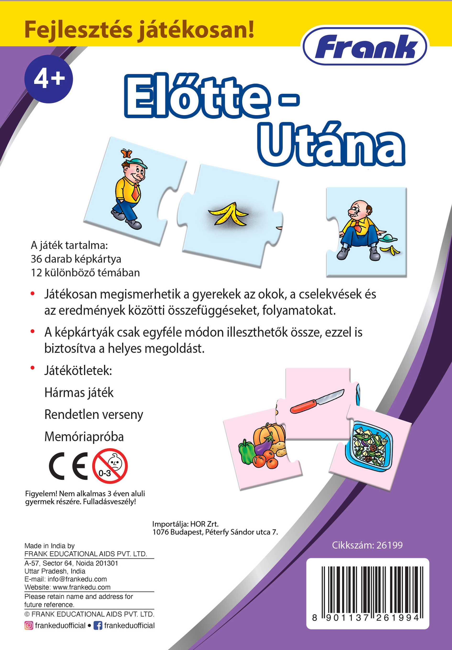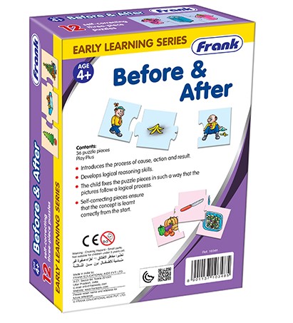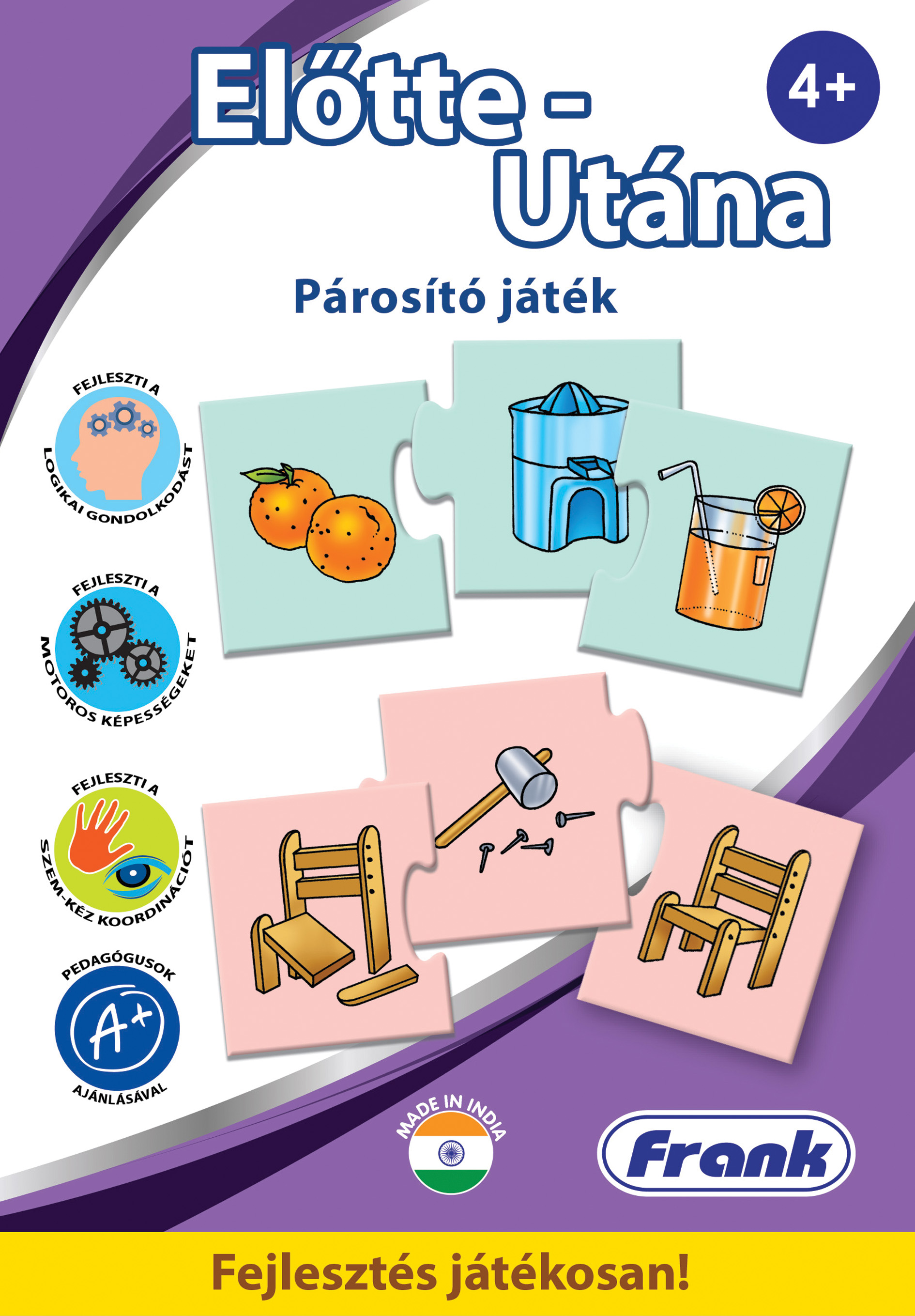 Az „Előtte–Utána” fejlesztő játék egy vizuális-logikai gondolkodást fejlesztő eszköz, amely kifejezetten 4 éves kortól ajánlott, és ideális kiegészítője lehet az óvodai nevelés mindennapi gyakorlatának.