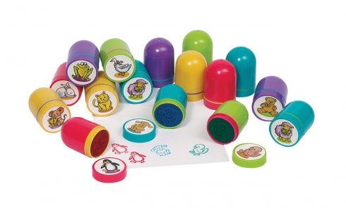 A készlet 10 db különböző állatos mintájú nyomdát tartalmaz, mindegyikben beépített festékpárna (tintapárna) van.
