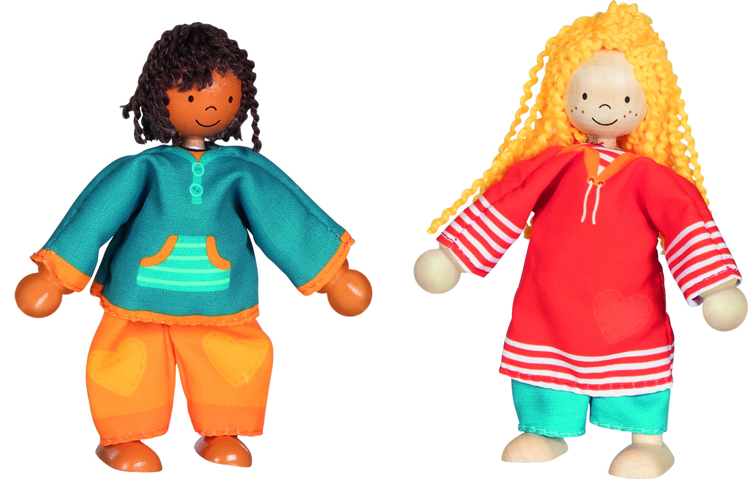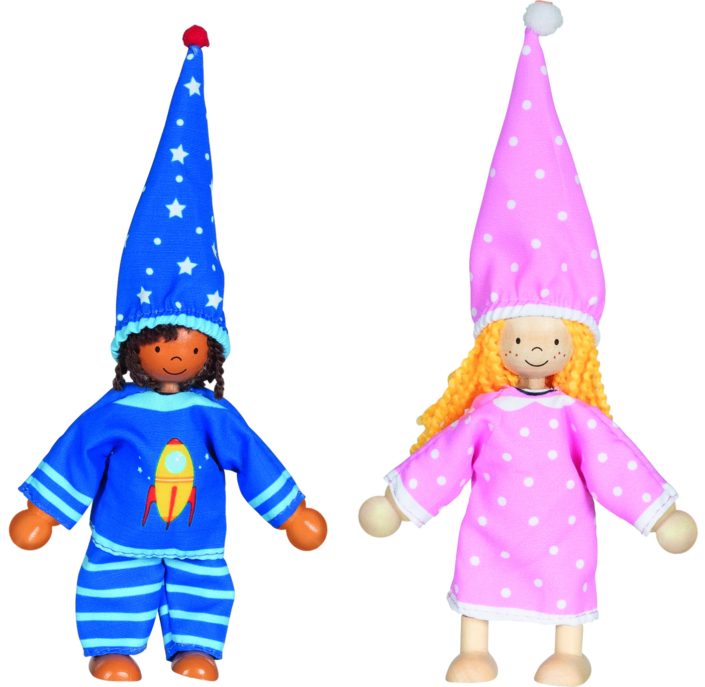 Öltöztetős játék. A szett tartalma: 2 db fa baba, 6 garnitúra játék baba ruha, 1 db fa tároló doboz. A babák végtagjai mozgathatóak. A doboz mérete: 12,5x12,5x4,8 cm