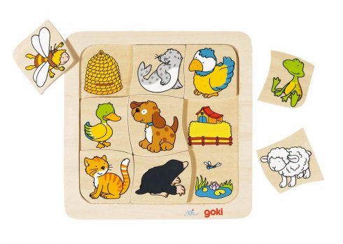 A Goki párosítós, puzzle kirakója teljes mértékben fából készült, egészségre káros anyagokat nem tartalmaz. A fatáblás kirakón ismert állatok láthatók, mint például a madárka, kutya, méhecske, cica, fóka, béka, bárány, kacsa és a vakond. Mind a 9 állat külön-külön helyezkedik el egy-egy puzzle elemen. A fatáblán az állatokhoz köthető élőhelyek láthatók, így a gyermekeknek ki kell találni, hogy melyik állat hol él. Az állatok és az élőhelyeik is élénk színekkel lettek megfestve. A vidám és játékos jelleget erősíti, hogy a puzzle elemek nem szabályos formájúak, mindegyik lap széle hullámos. Tartalma: 1 db 18x18 cm-es figurás tábla 9 db puzzle 24 hónapos korú gyermekek használatára CE minősítéssel ellátva!