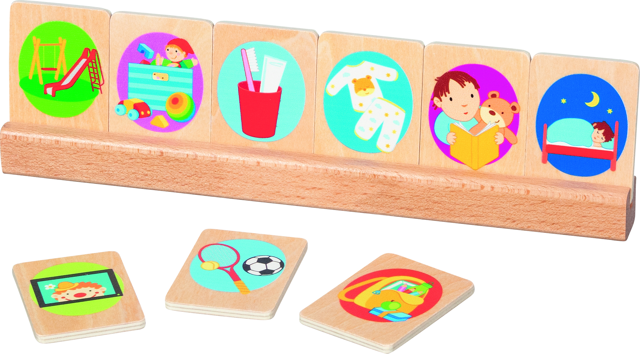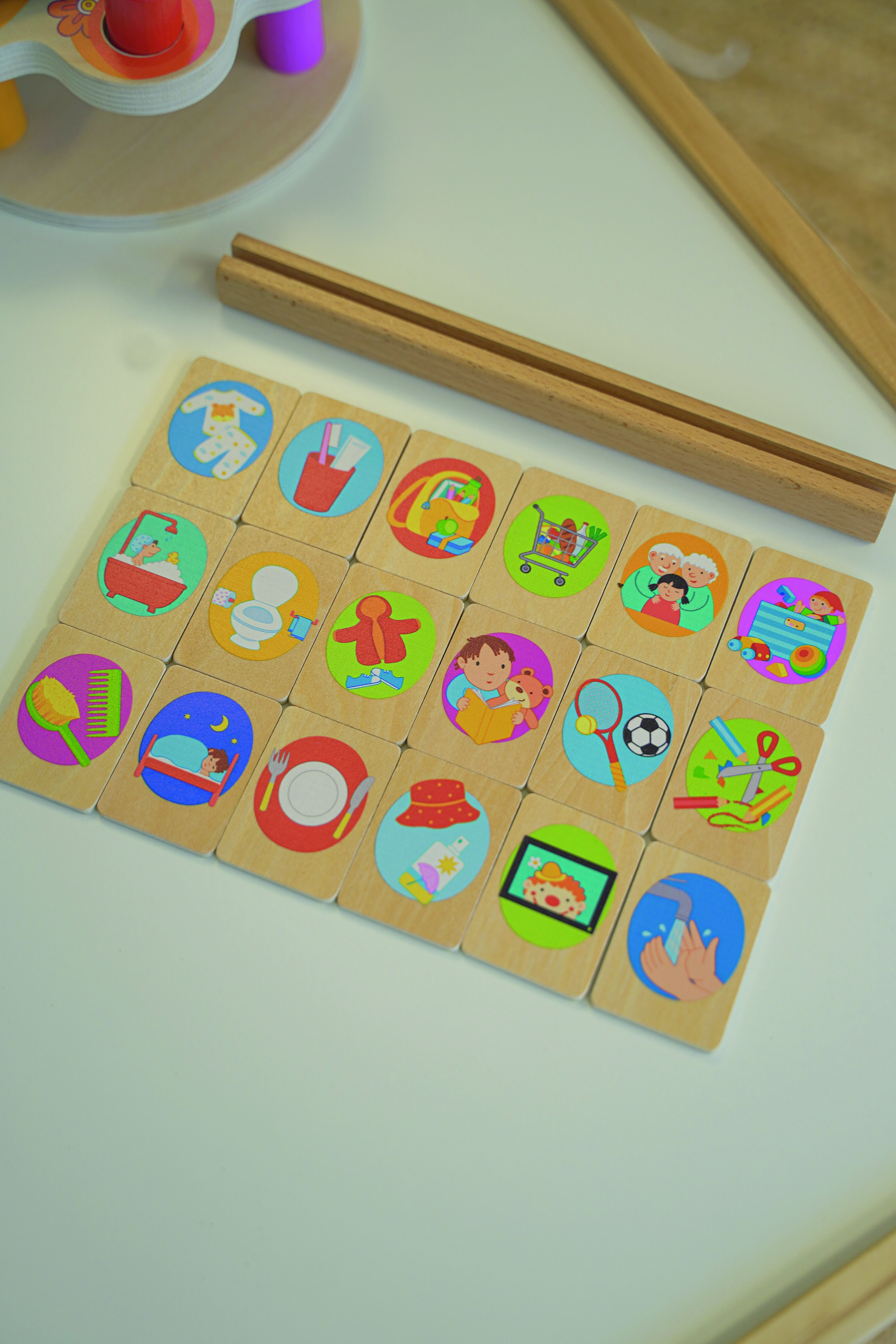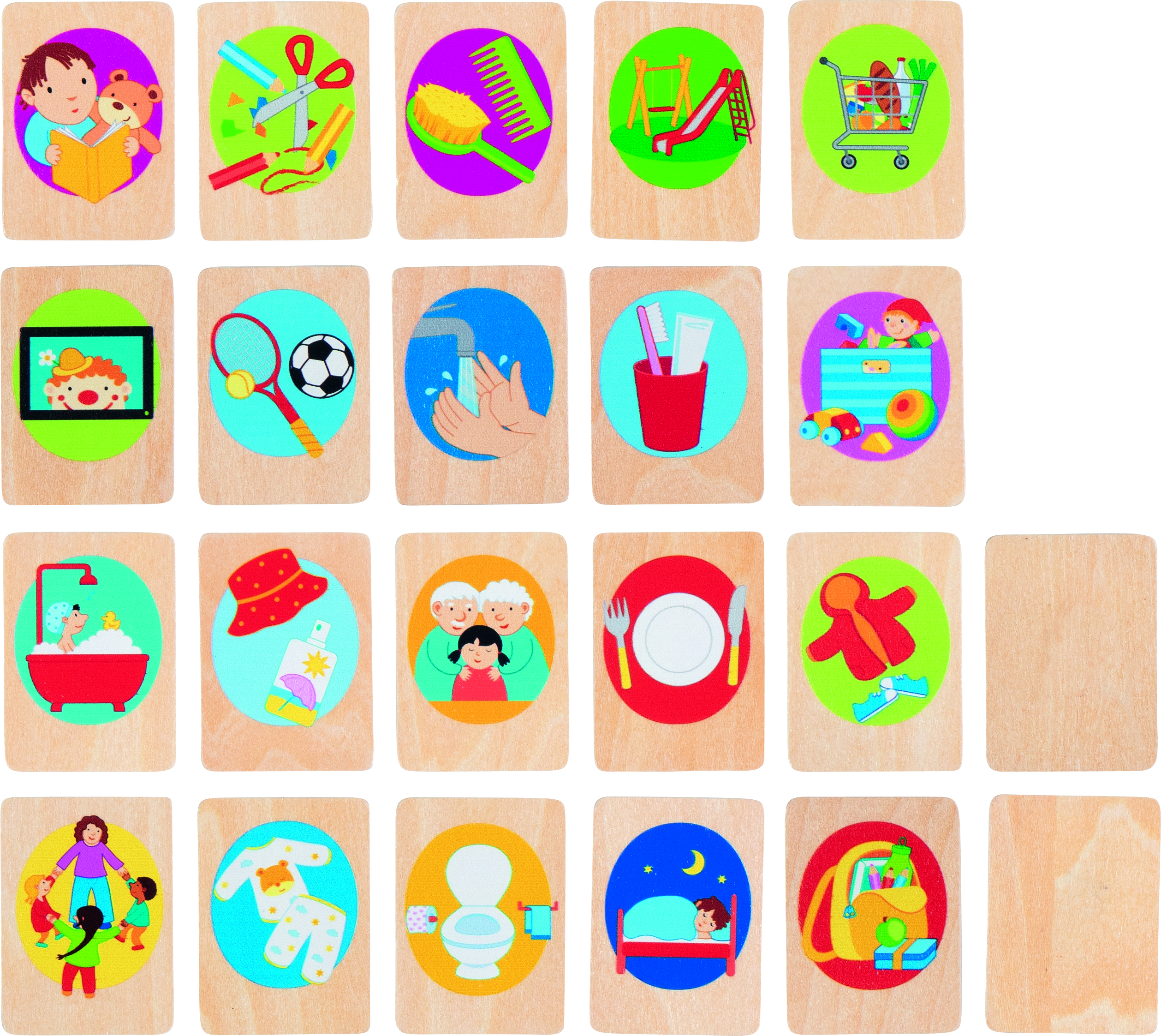 Napi tevékenységek – sorrendiség Tartalma: - 21 db illusztrált fa kártya - 2 db üres fa kártya - A kártyák mérete: 5,5x4 cm - Fejlesztési terület: beszédkészség, memória, tervezés, logikai gondolkodás, sorrendiség felismerése - Felhasználás: óvoda, fejlesztő környezet, otthoni játék