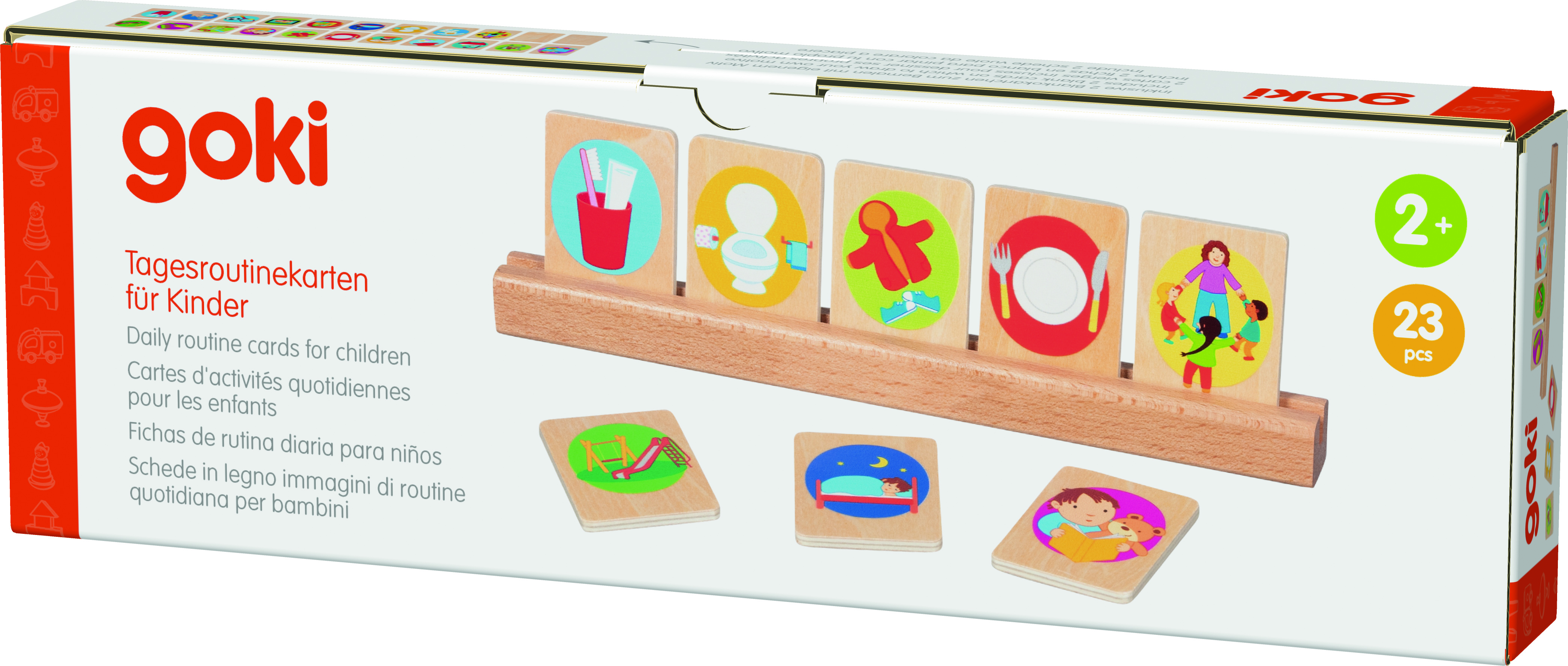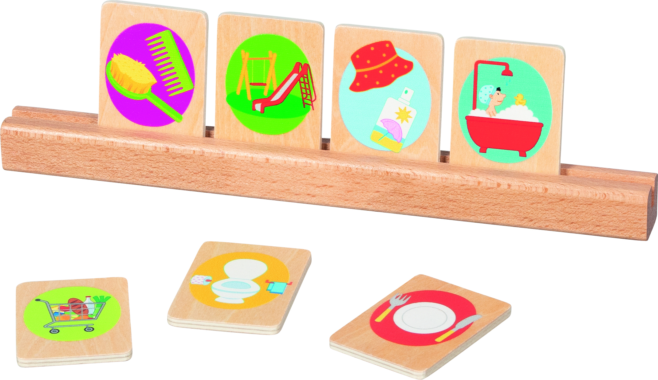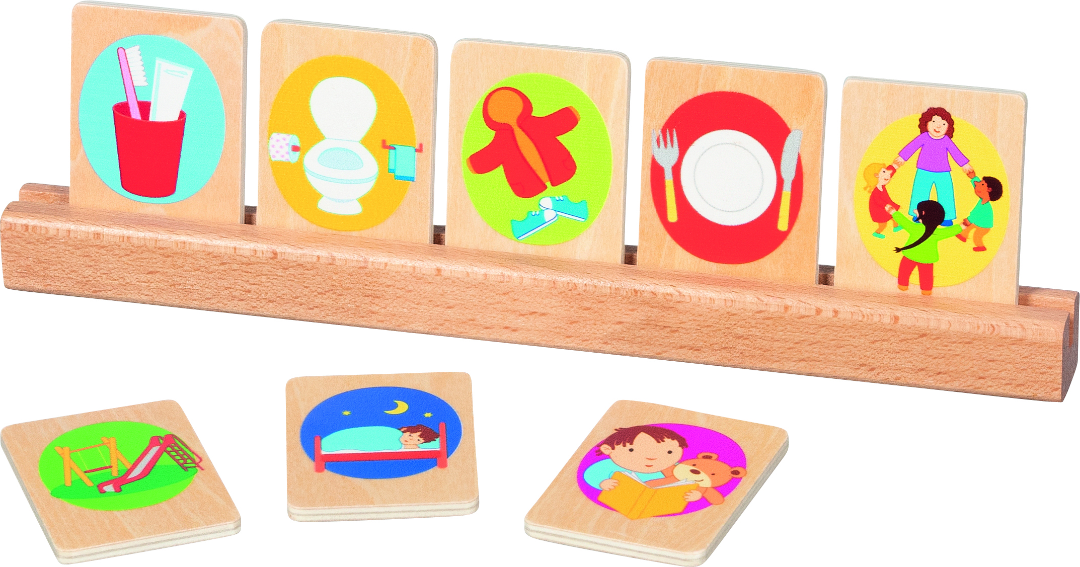 Napi tevékenységek – sorrendiség Tartalma: - 21 db illusztrált fa kártya - 2 db üres fa kártya - A kártyák mérete: 5,5x4 cm - Fejlesztési terület: beszédkészség, memória, tervezés, logikai gondolkodás, sorrendiség felismerése - Felhasználás: óvoda, fejlesztő környezet, otthoni játék
