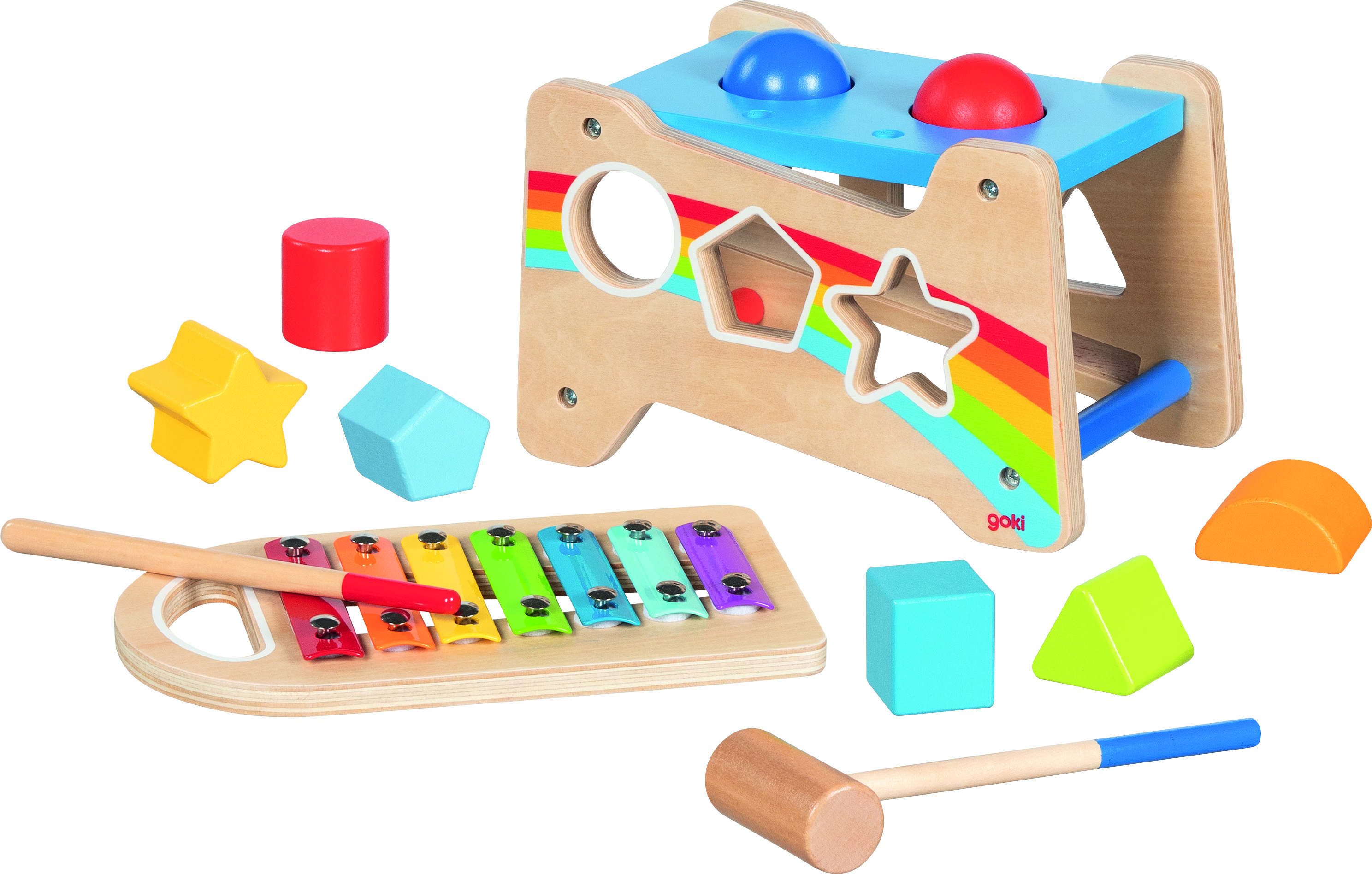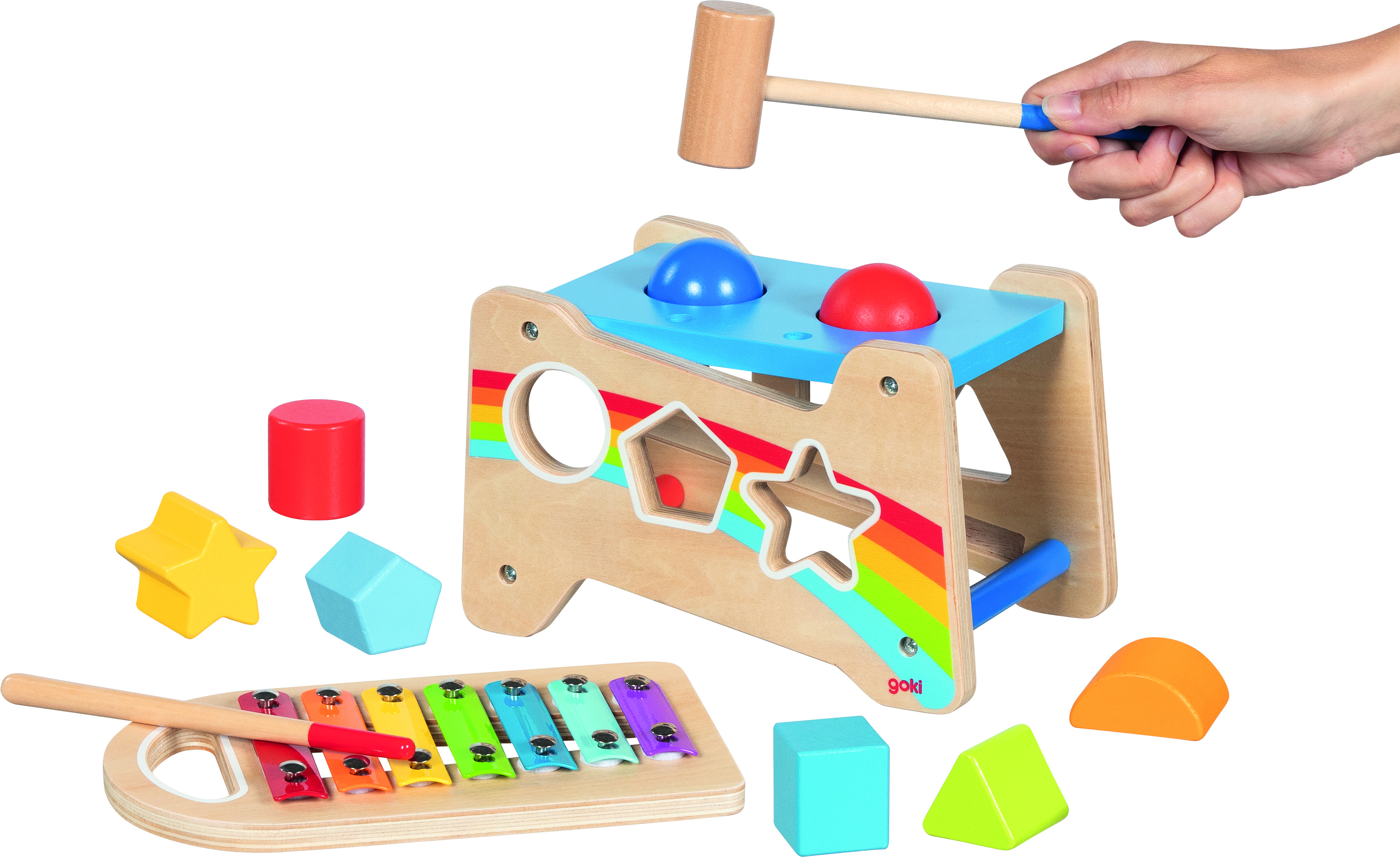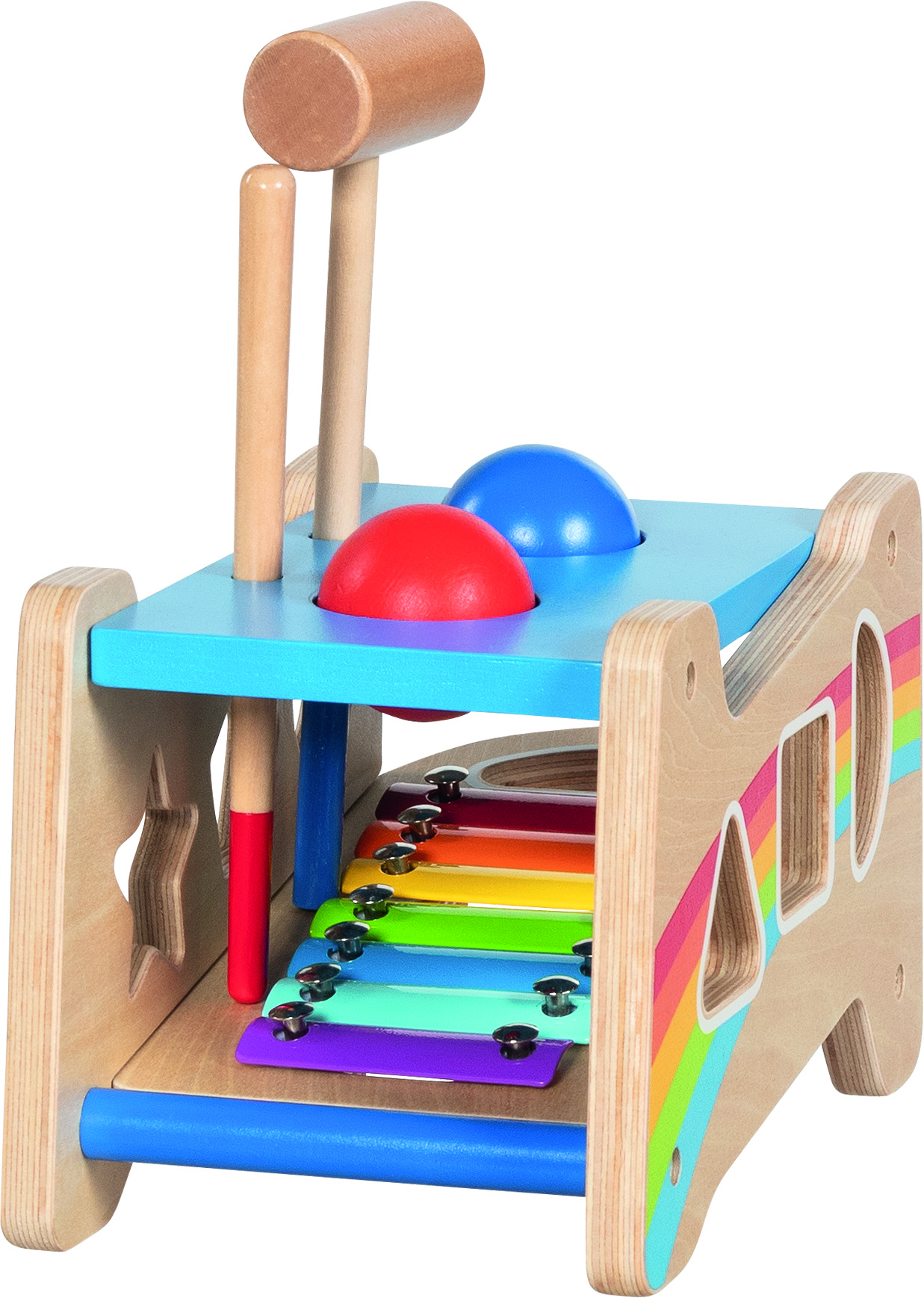 A fa golyók leütésekor – a behelyezett xilofon esetén – vidám hangot ad, így a klasszikus kalapálós játék zenei élménnyel egészül ki.