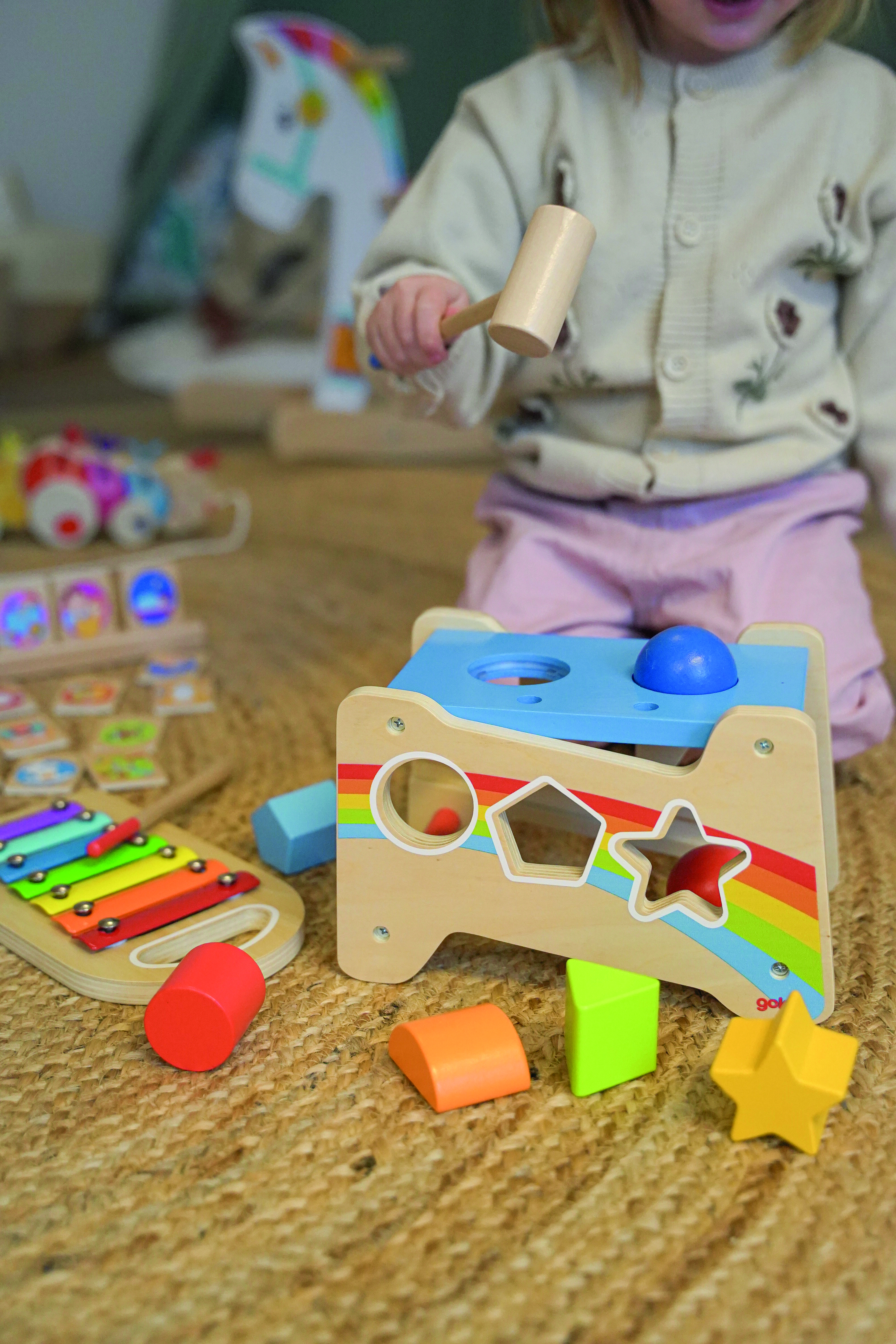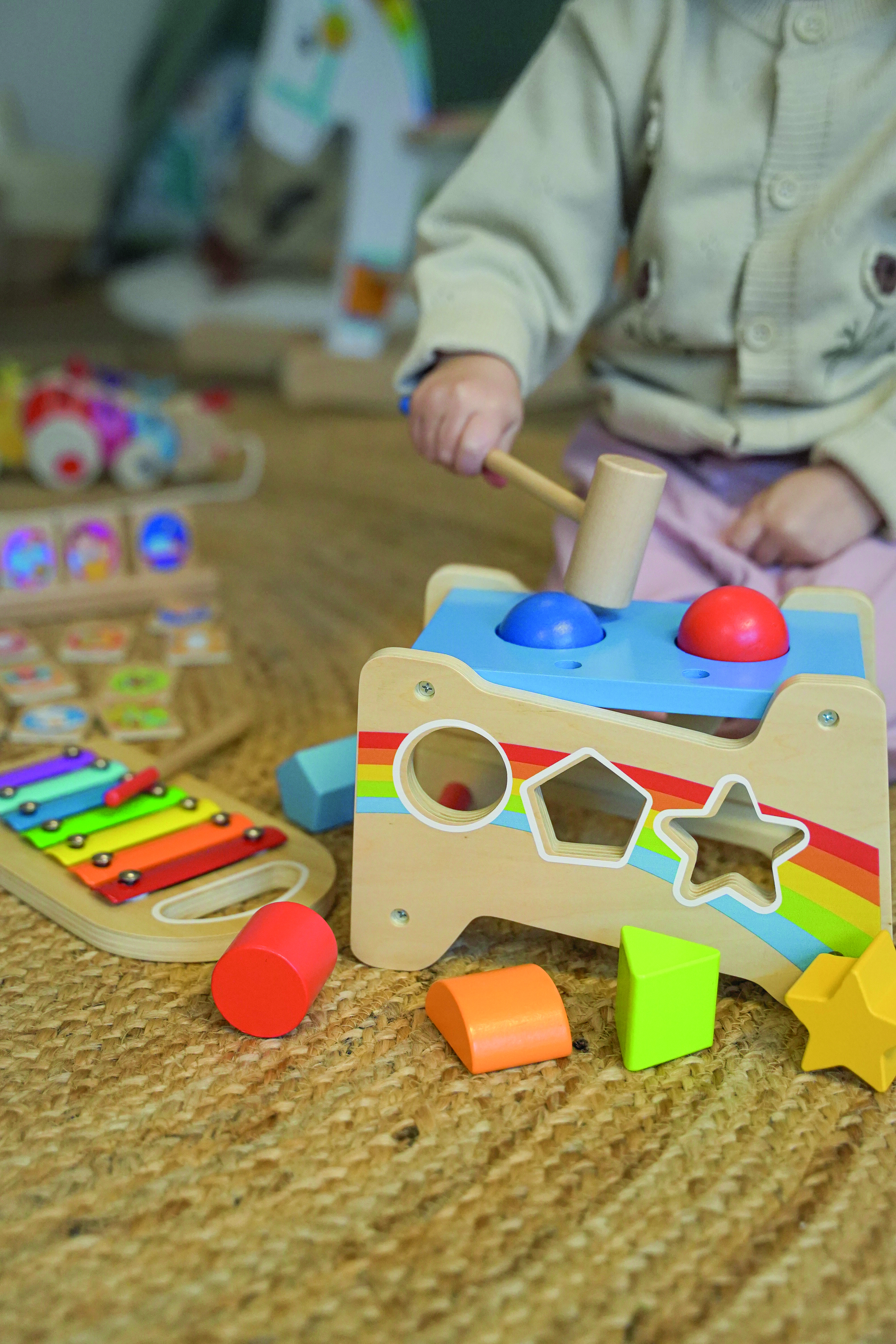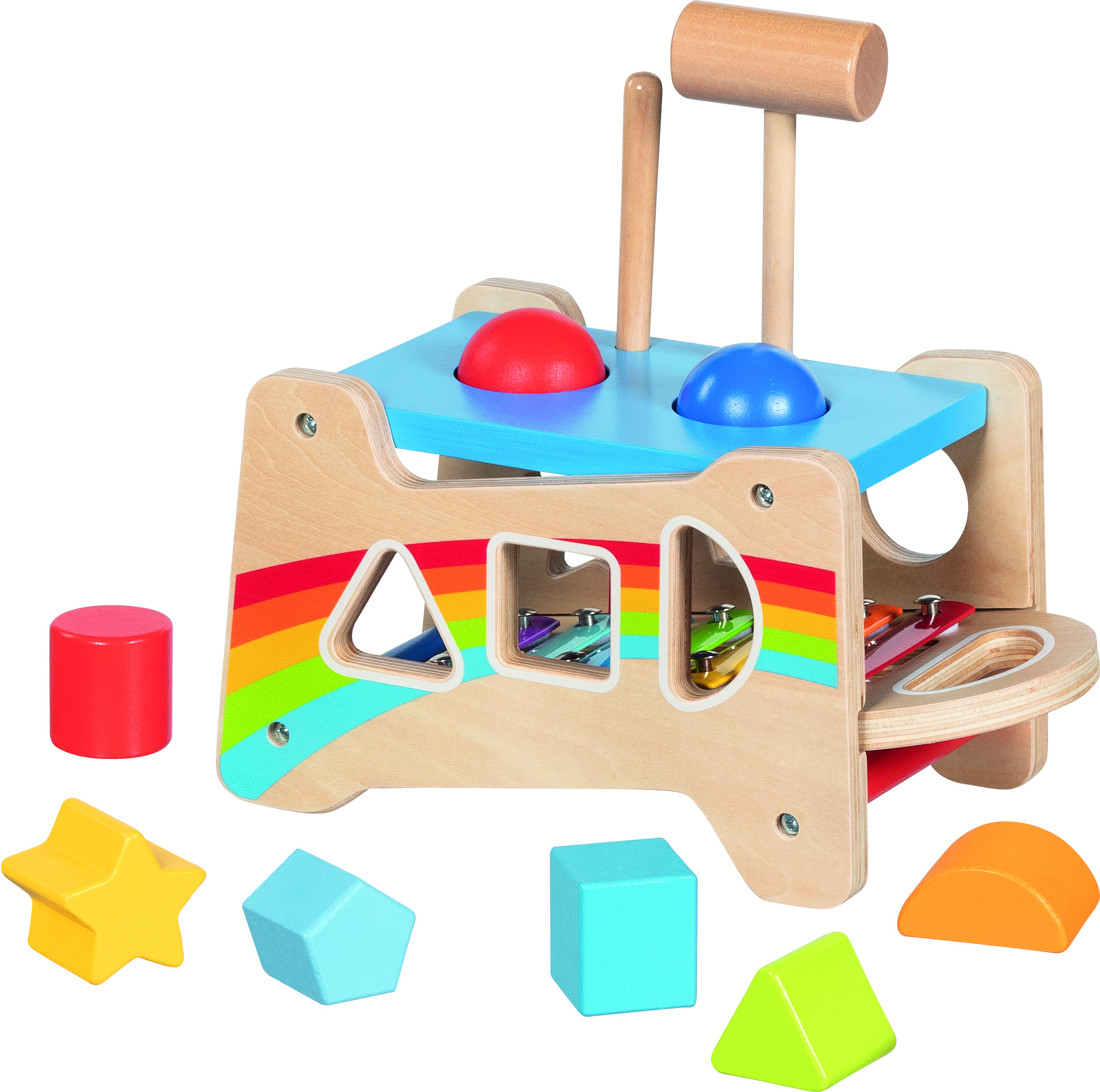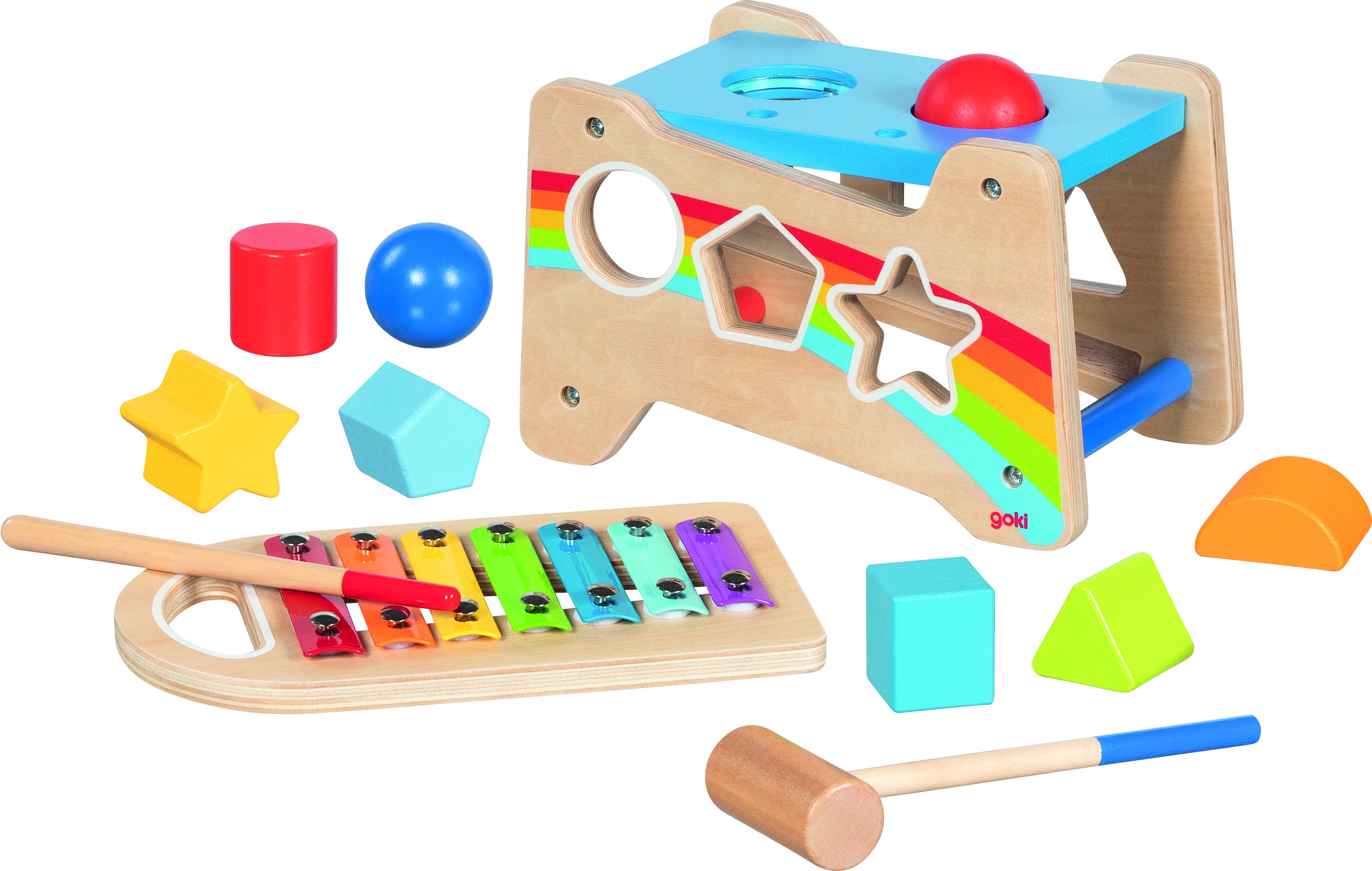 A fa golyók leütésekor – a behelyezett xilofon esetén – vidám hangot ad, így a klasszikus kalapálós játék zenei élménnyel egészül ki.