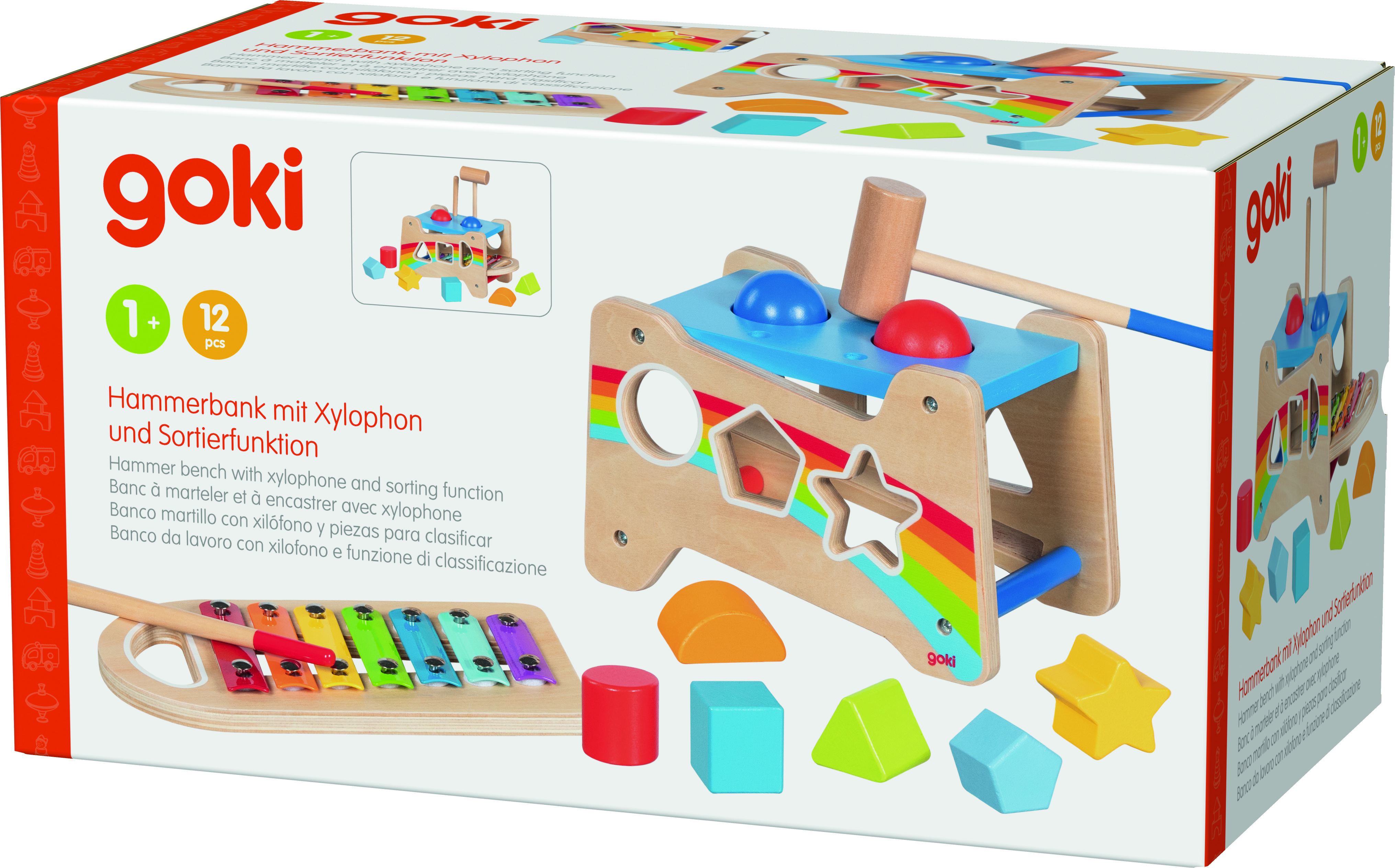 Kalapálos formakereső xylophon Tartalma: - 1 db kalapálós pad beépített formabedobóval - 1 db kivehető xilofon - 1 db fakalapács - fa golyók - színes formaelemek - A termék mérete: 21,5x13,8x13,8 cm - Fejlesztési terület: finommotorika, szem-kéz koordináció, ritmusérzék, hallási észlelés, logikai gondolkodás, színfelismerés - Felhasználás: bölcsőde, óvoda, fejlesztő környezet, otthoni játék