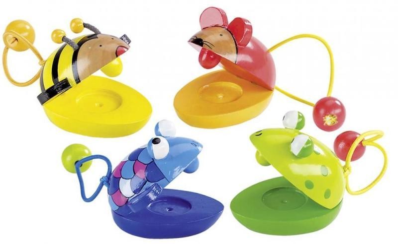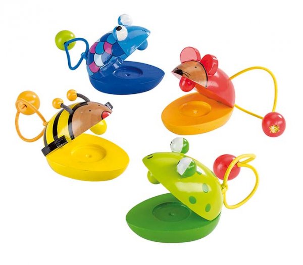 A fa kasztanyetta állatos motívummal készül, kényelmesen fogható kis méretben.