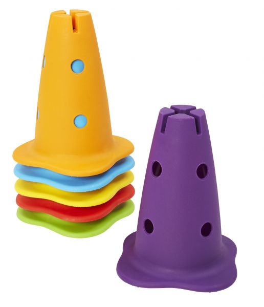 A Gonge 6 db-os bója készletének elemei strapabíró, kemény műanyagból készült. A bóják mind más-más színűek, így megtalálható a lila, a zöld, a narancs- és a citromsárga, a piros és a kék színű is. Kialakításuknak köszönhetően egymásba rakhatóak, ezáltal tárolásuk egyszerű. A bóják jól beilleszthetőek az akadálypályákba, a rajtuk található lyukakba (átmérőjük: 25 mm) helyezhető rudakkal újabb akadályok hozhatóak létre. Magasságuk: 28,5 cm Szélességük: 21 cm Átmérőjük: 21 cm 24 hónapos korú gyermekek használatára CE minősítéssel ellátva! Ájánlott korosztály: 2 – 99 év