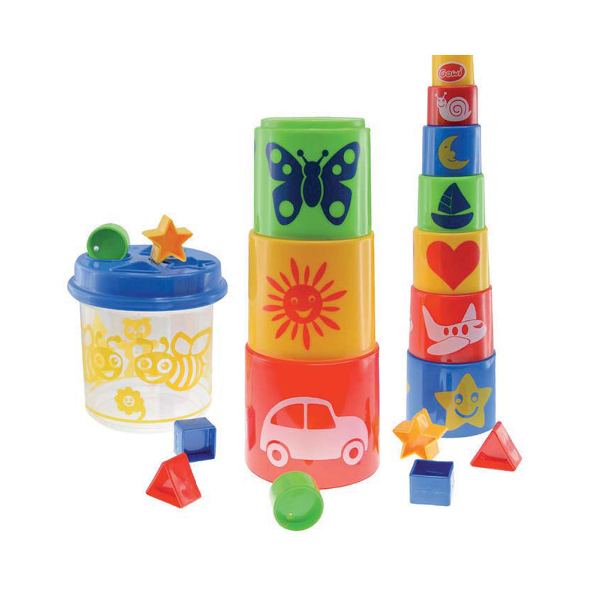 A játék tudatosítja a kicsikben a sorrendiséget, továbbá fejleszti a forma-, méret- és színfelismerést. A termék Montessori toronyépítőként és formabedobóként is használható. Élénk és vidám színeinek köszönhetően sokáig leköti a kicsiket.