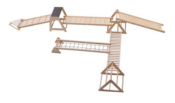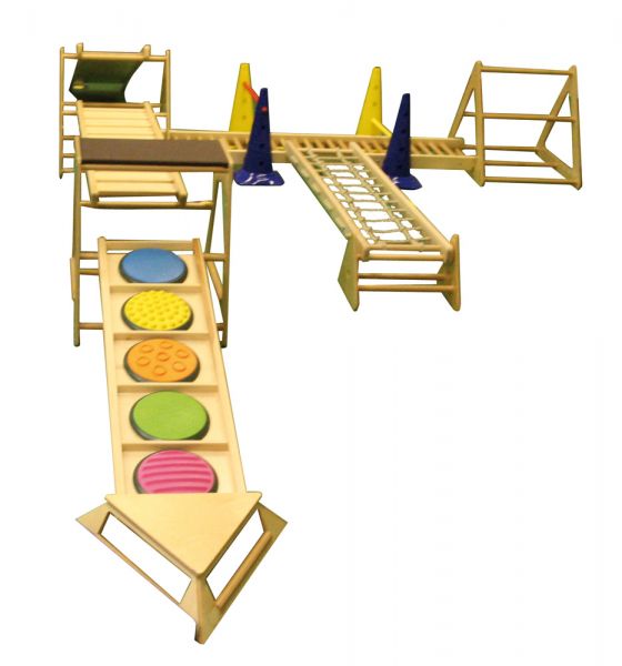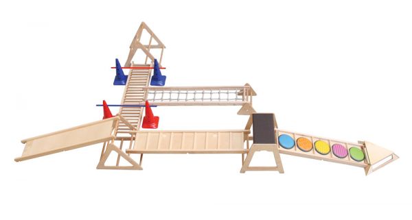 A RillaGym tömör bükkfából készült, strapabíró, többfunkciós mozgásfejlesztő készlet, amely különböző koordinációs képességek fejlesztésére alkalmas. Terhelhetőség: 60 kg Tartalma: - 1 db 68x68x15 cm-es sziget - 2 db 60x74x66 cm-es háromszög - 1 db 60x67x72 cm-es center - 1 db 190x40x8 cm-es létra - 1 db 190x40x8 cm-es mászóháló - 1 db 190x40x8 cm-es csúszda - 1 db 190x40x8 cm-es sétáló - 1 db 153x40x8 cm-es érzékelő ösvény - 1 db 47x35x31 cm-es billentő