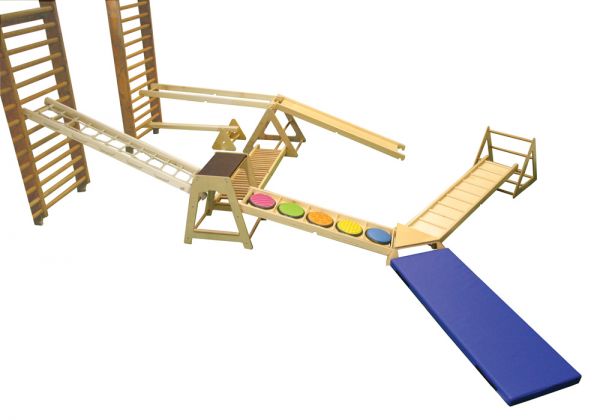 A RillaGym tömör bükkfából készült, strapabíró, többfunkciós mozgásfejlesztő készlet, amely különböző koordinációs képességek fejlesztésére alkalmas. Terhelhetőség: 60 kg Tartalma: - 1 db 47x35x31 cm-es billentő - 2 db 60x74x66 cm-es háromszög - 1 db 60x67x72-es center - 1 db 68x68x15 cm-es sziget - 1 db 140x10x6 cm-es gerenda - 1 db 190x40x8 cm-es korlát - 1 db 190x40x8 cm-es csúszda - 1 db 190x40x8 cm-es létra - 1 db 190x40x8 cm-es mászóháló - 1 db 153x40x8 cm-es érzékelő ösvény - 1 db 190x40x8 cm-es sétáló A KÉSZLET AZ ÉRZÉKELŐKORONGOKAT, A MATRACOT ÉS A BORDÁSFALAKAT NEM TARTALMAZZA!!!