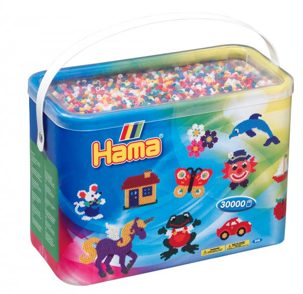 30 000 darabos óriás kiszerelésű vegyes színű színű vasalható gyöngy tároló dobozban. A készlet az alábbi színeket tartalmazza: Fehér, krém, sárga, narancssárga, piros, rózsaszín, lila, kék, világoskék, fenyőzöld, világoszöld, barna, szürke, fekete, vörösesbarna. Alkothatunk vele kedves állat- vagy emberfigurákat, poháralátéteket, vagy akár ajándéktárgyakat. Segítségképpen használhatunk Hama ötletfüzetet is, de hagyatkozhatunk akár a fantáziánkra is.