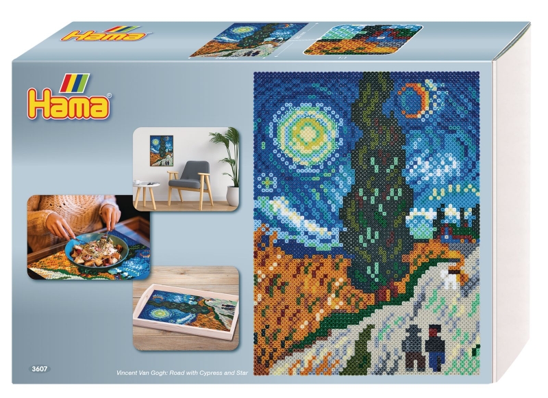 Ebben a készletben 10000 db vegyes színű, Midi vasalható gyöngy és 6 db összekapcsolható négyzet alaplap található, valamint színes összerakási segédlet és még vasalópapír is. Csodálatos képeket alkothatunk, melyek akár egészen nagy méretűek is lehetnek. Az összerakási segédletet a híres holland posztimpresszionista festő, Vincent van Gogh munkái ihlették. Az Út a ciprusokkal és a csillaggal című, 1890-ben készült képet csillagászok is vizsgálták. Számítógépes szimulációval bebizonyították, hogy a Holddal átellenben látható csillag a Vénusz, a vászon bal oldalán pedig a Merkúrt ábrázolta a művész, de a kép összhangja és kompozíciós okokból tükrözte, tehát a képen megfordította az égitesteket elhelyezkedését. Ennek a három égitestnek együttállása pedig mindössze egyetlen estén, 1890 április 20-án volt látható. Az igazi Hama rajongók biztosan értékelni fogják, hogy ezzel a különleges készlettel olyan gyönyörű képeket lehet készíteni, mintha igazi festmények lennének. A képet nézve olyan érzése van az embernek, mintha valóban a az úton állna a ciprus előtt. Az elkészült kép dísze is lehet a szobának, vagy mint nagyszerű személyre szóló ajándék okozhat örömet. Ez a készlet inkább a felnőttek számára kínál izgalmas szórakozást. A Hama készletek nagy előnye hogy egy szettben az összes hozzávaló megtalálható. Alaplap, gyöngyök és a vasalópapír. Ha ezt választjuk, akkor nem kell azon gondolkodni hogy milyen további kiegészítőkre van még szükségünk. Hiszen minden benne van a készletben! A figurás alaplap igazán nagy segítség a kicsiknek a kép kirakásakor. Itt már csak a színekre, szimmetriára kell összpontosítaniuk. A Hama vasalható gyöngyöket egyedülálló szín- és alaplap választéka, három eltérő mérete könnyen megkülönbözteti az összes többi vasalható gyöngytől. A Hama gyöngy Dániában készül, ahol rendkívül nagy figyelmet fordítanak a játékok minőségére, biztonságosságára. Termékválasztásnál kérjük az alábbiakra figyeljen: Midi gyöngyhöz csak Midi alaplap használható! (5 éves kortól ajánlott) Maxi gyöngyhöz csak Maxi alaplap használható! (3 éves kortól ajánlott)