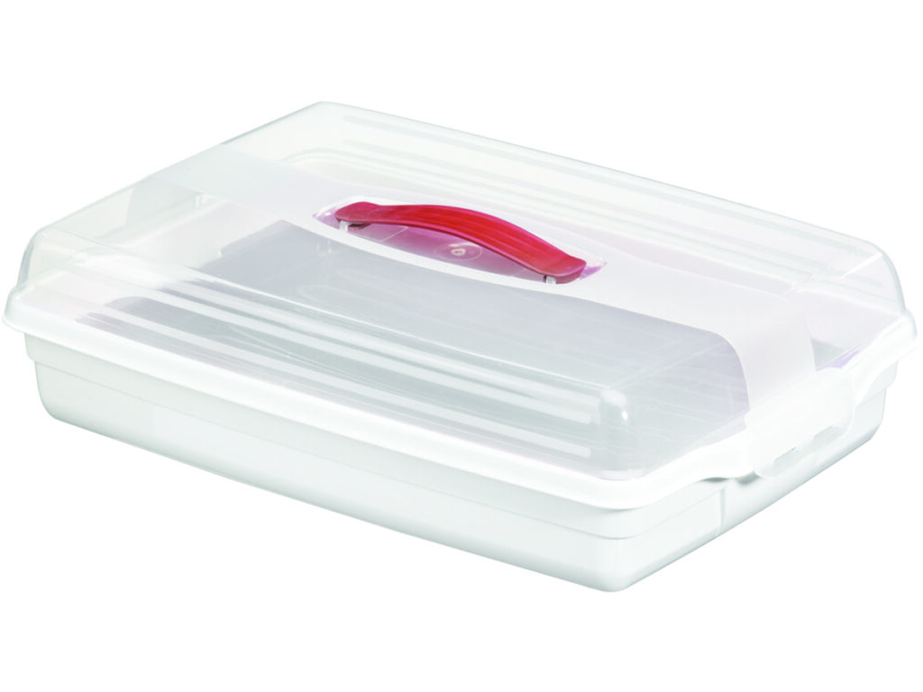 Mérete: 45x29,5x11,1 cm A szendvics és süteménytároló doboz kétszintes kialakításának köszönhetően nagyon jól kihasználható a doboz teljes magassága. Fehér színű alsó és áttetsző felső része letisztult külsőt kölcsönöz neki. Erős csatos oldalai és felső fogantyújának köszönhetően a sütemények és szendvicsek biztonságosan szállíthatók. Belső tálcája kivehető.