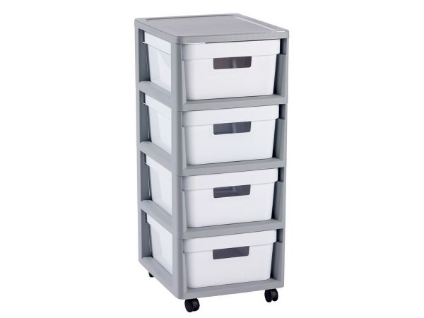 Legyen végre minden apróságnak valami helye! A szekrény négy nagy méretű fiókból áll, amelyeknek kényelmes fogókája van. Egyszerű, skandináv stílusának köszönhetően a szekrény ideális a fürdőszobába, hálószobába, nappaliba és gardróbba is. A kényelmes használatot annak kerekei is biztosítják. Könnyen helyezhetjük át a bútordarabot. Sima felületét könnyű tisztítani.