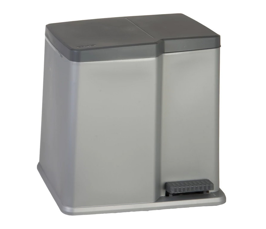 Szelektív duo szemetes 21 l-es, pedálos Tartalma: 1 db pedálos szemetes két belső rekesszel Mérete: 40,5x30x42cm Anyaga: műanyag Űrtartalom: 21 l Szín: ezüst és sötétszürke