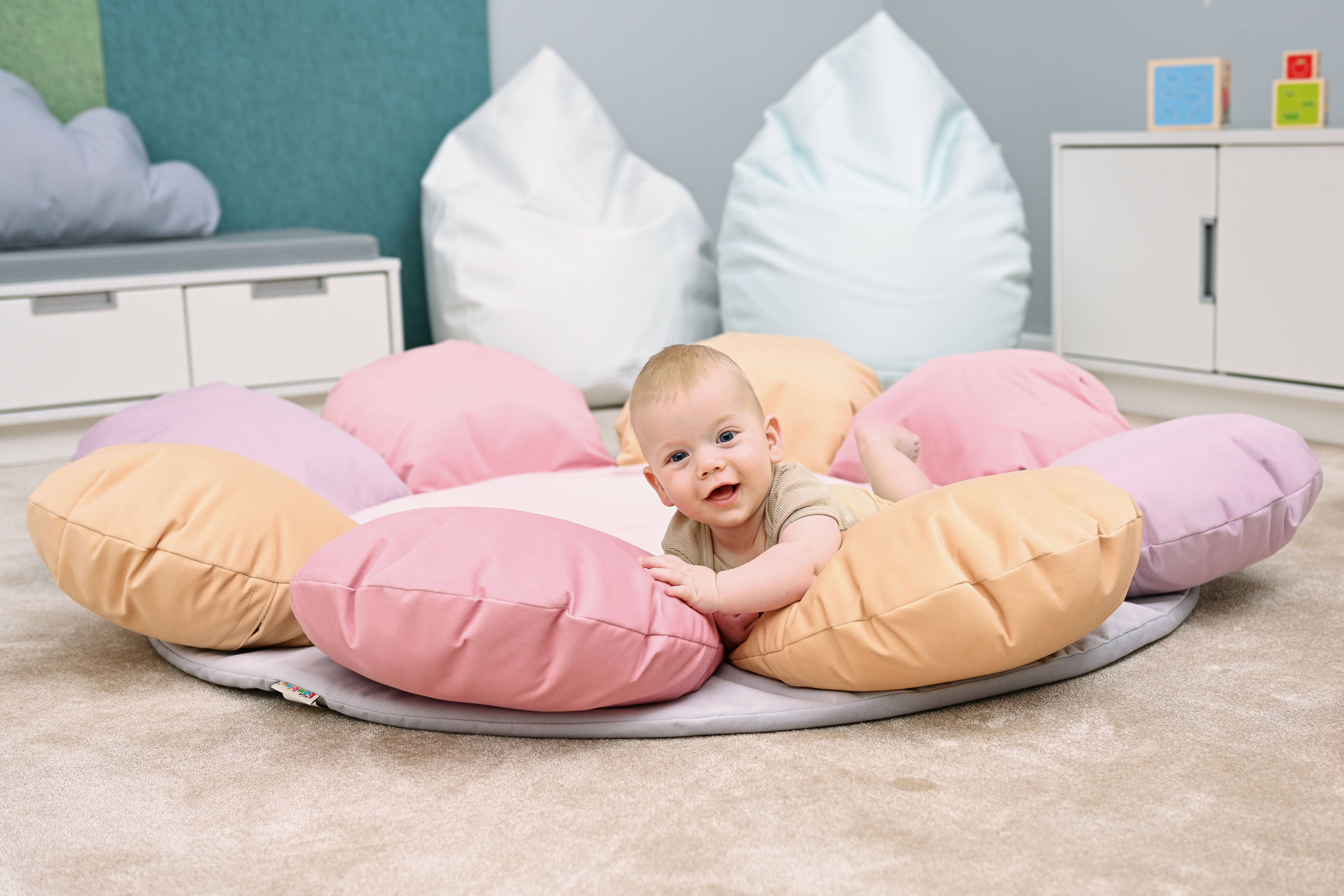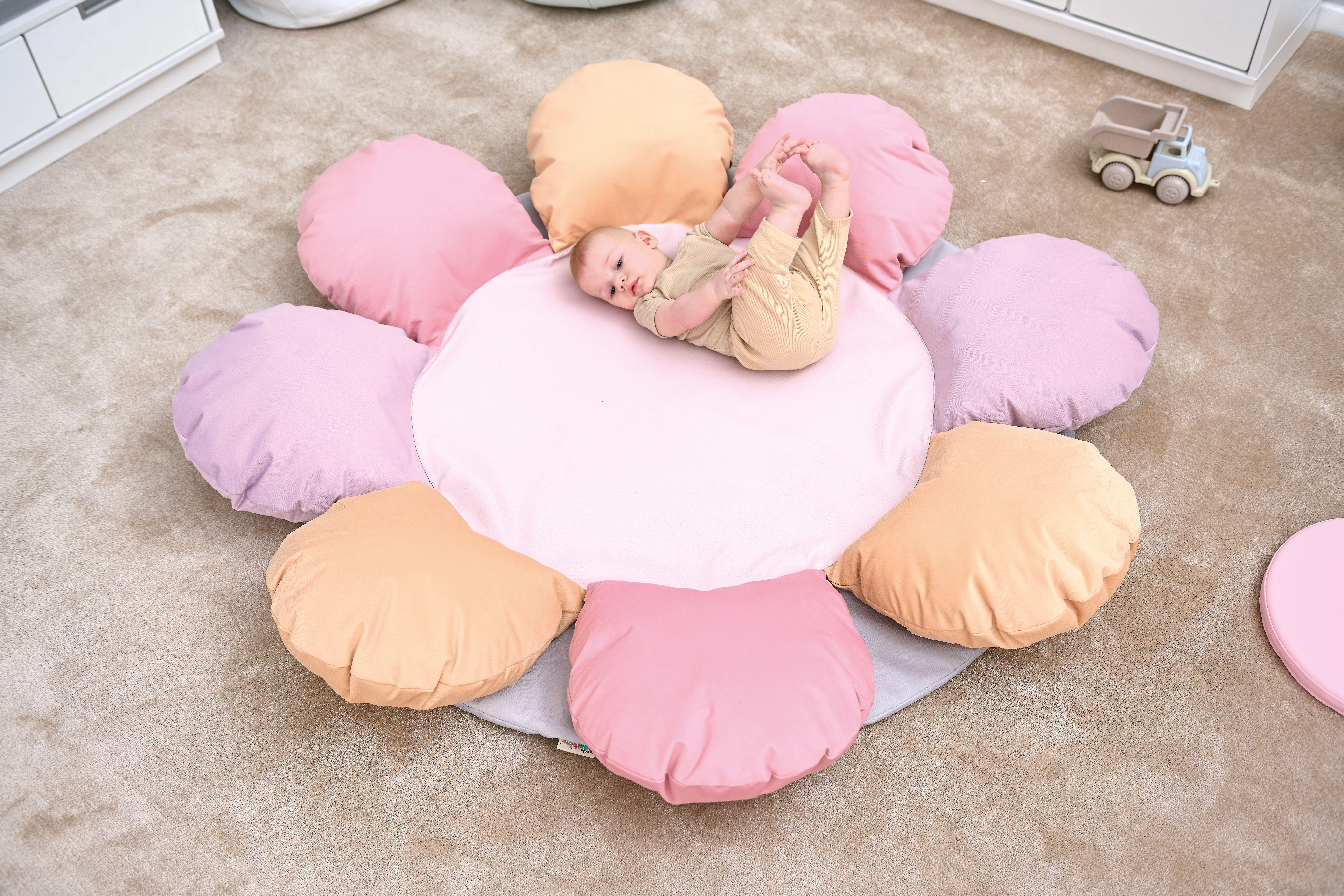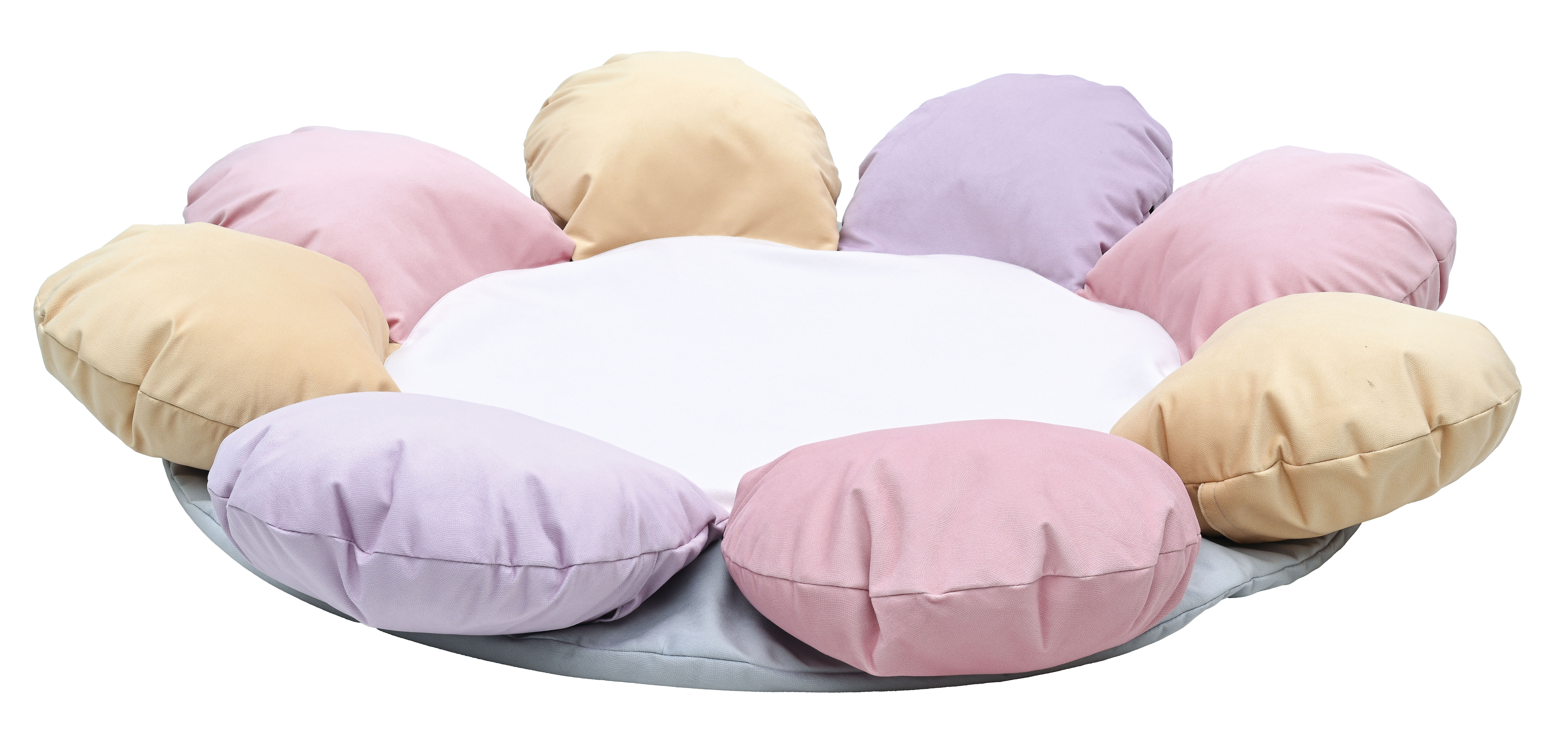 A puhasarok - virág formában egy puha szivacs szőnyeg, egyben 6 db gombóc alakú párnával, amik megtámasztják a legkisebbeket is, így biztosnággal játszhatnak. A szőnyeg kör alakú, alsó része halvány lila, a gombóc alakú virágszirmok pasztell lila, sárga és rózsaszínűek. A szőnyeg belső összetétele habszivacs, külső huzata pamutszövet. Huzata könnyen levehető és mosható. Átmérője: 150 cm, a párnák magassága: 17 cm. 6 hónapos kortól CE minősítéssel ellátva!