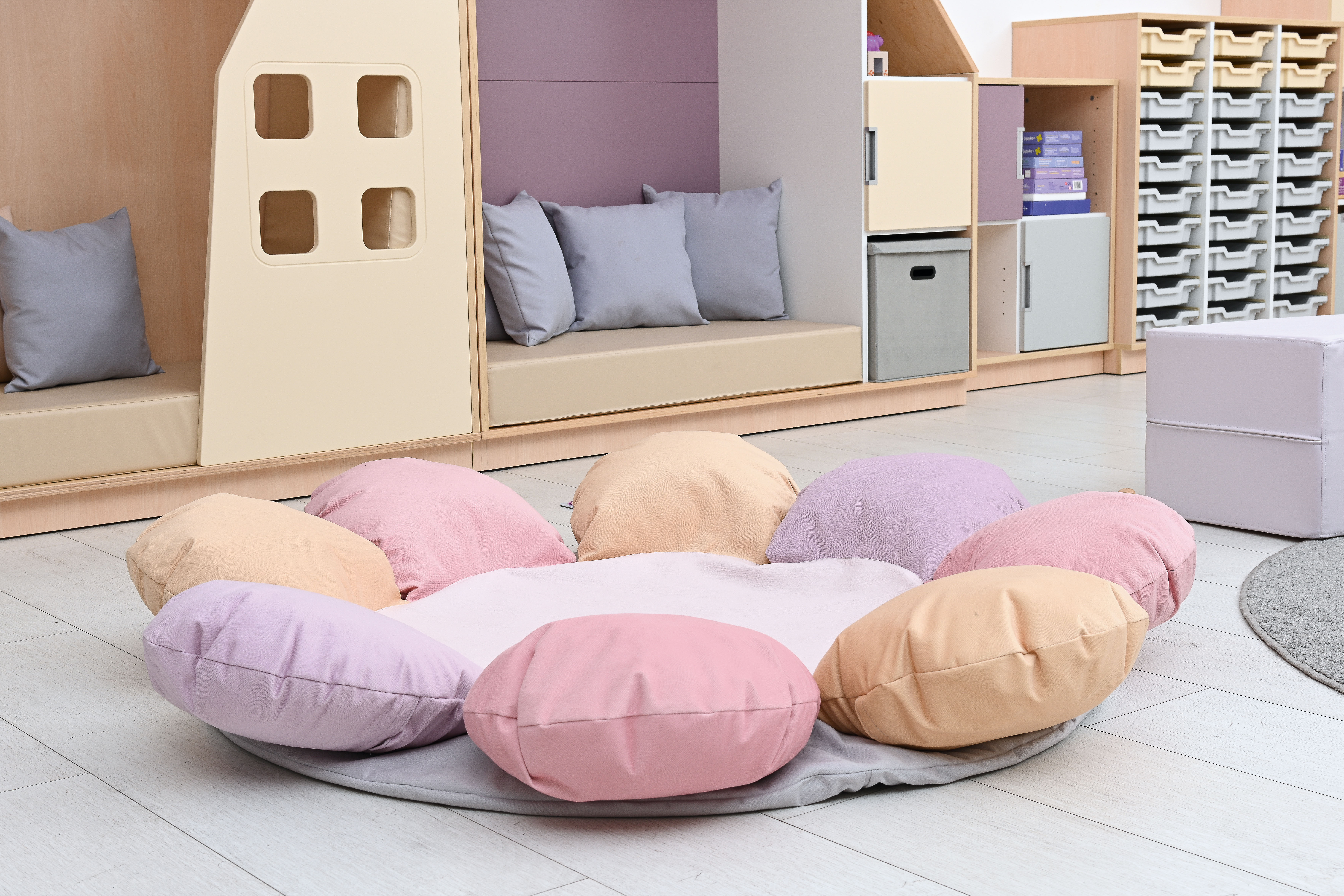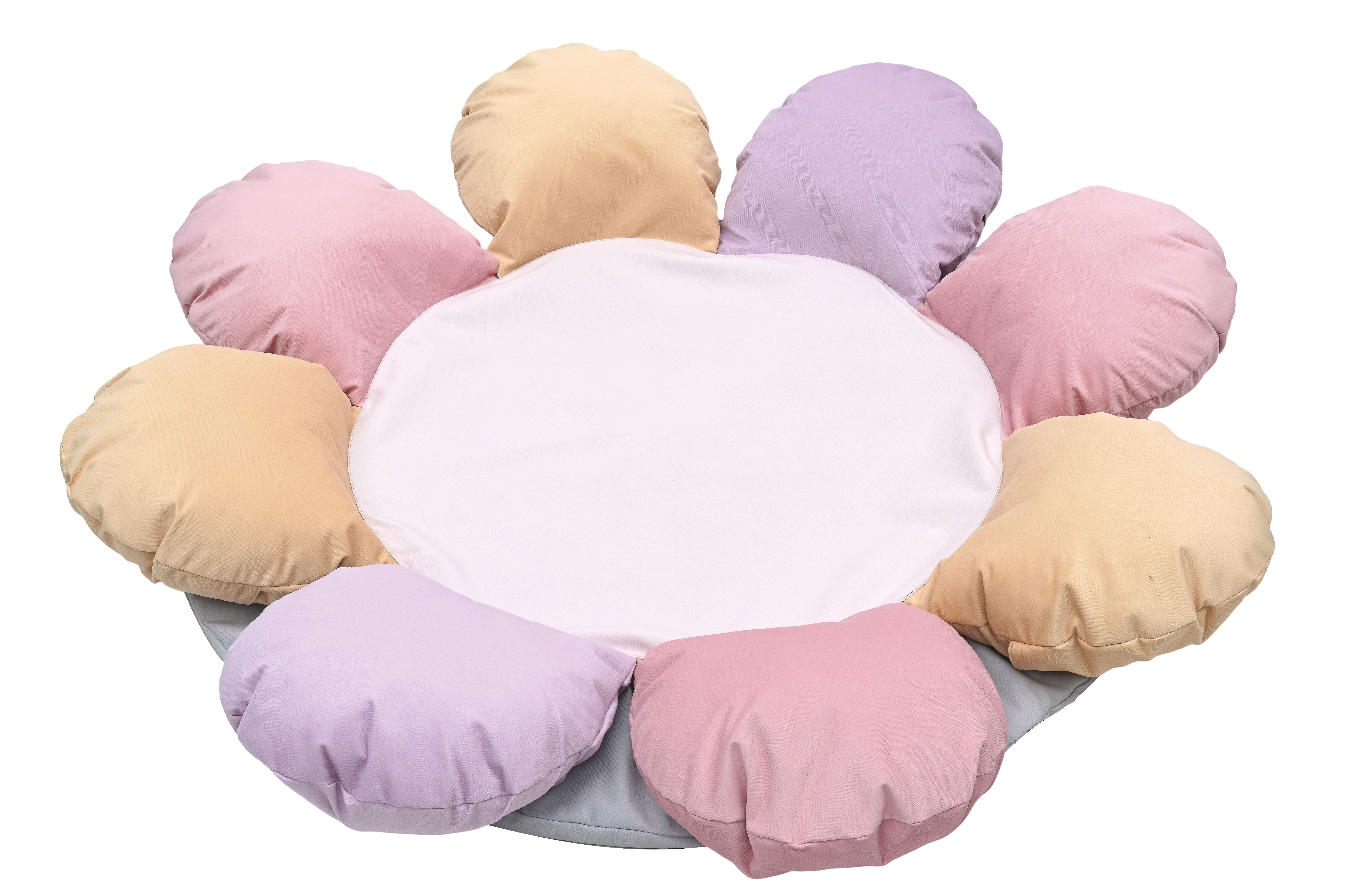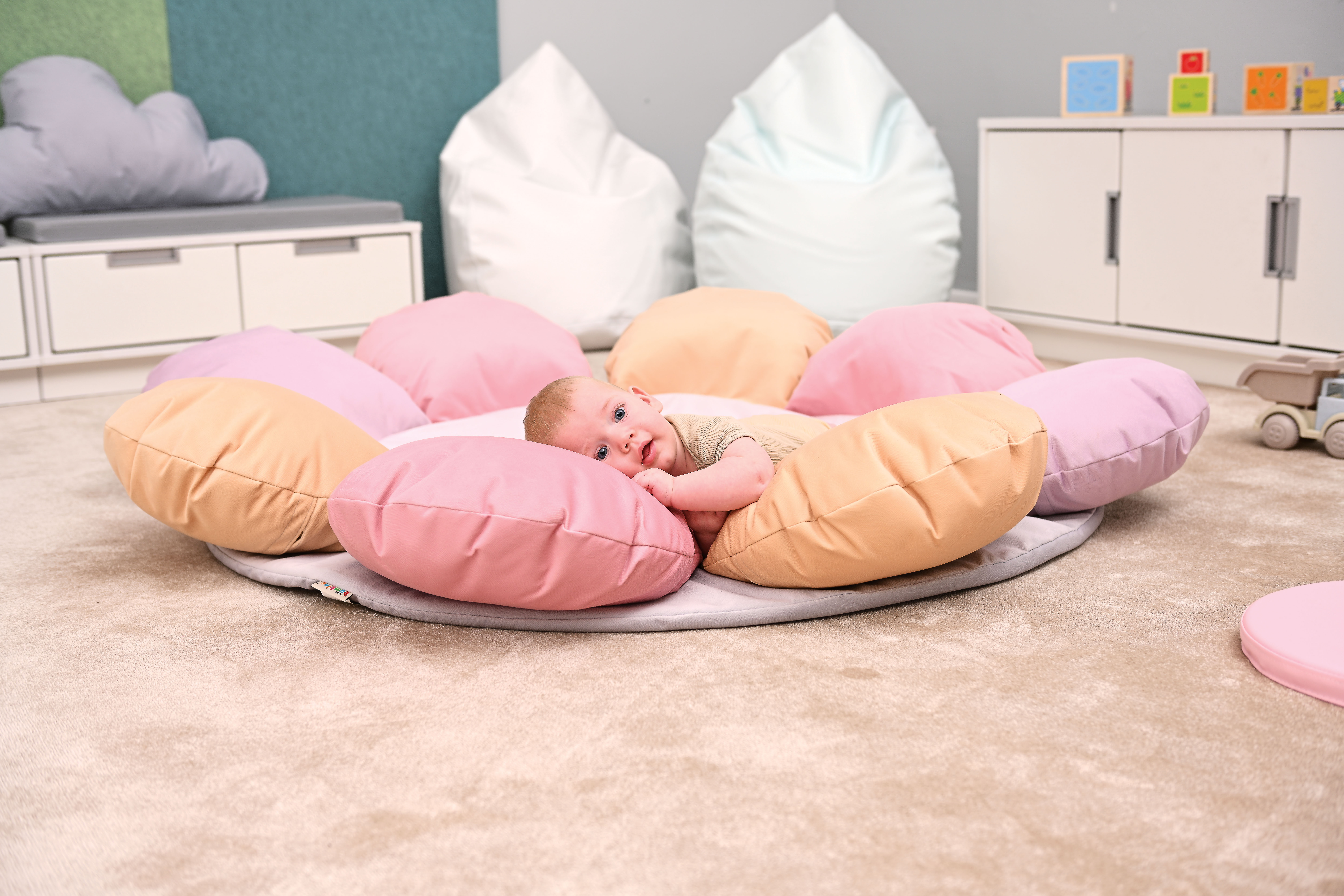 A puhasarok - virág formában egy puha szivacs szőnyeg, egyben 6 db gombóc alakú párnával, amik megtámasztják a legkisebbeket is, így biztosnággal játszhatnak. A szőnyeg kör alakú, alsó része halvány lila, a gombóc alakú virágszirmok pasztell lila, sárga és rózsaszínűek. A szőnyeg belső összetétele habszivacs, külső huzata pamutszövet. Huzata könnyen levehető és mosható. Átmérője: 150 cm, a párnák magassága: 17 cm. 6 hónapos kortól CE minősítéssel ellátva!