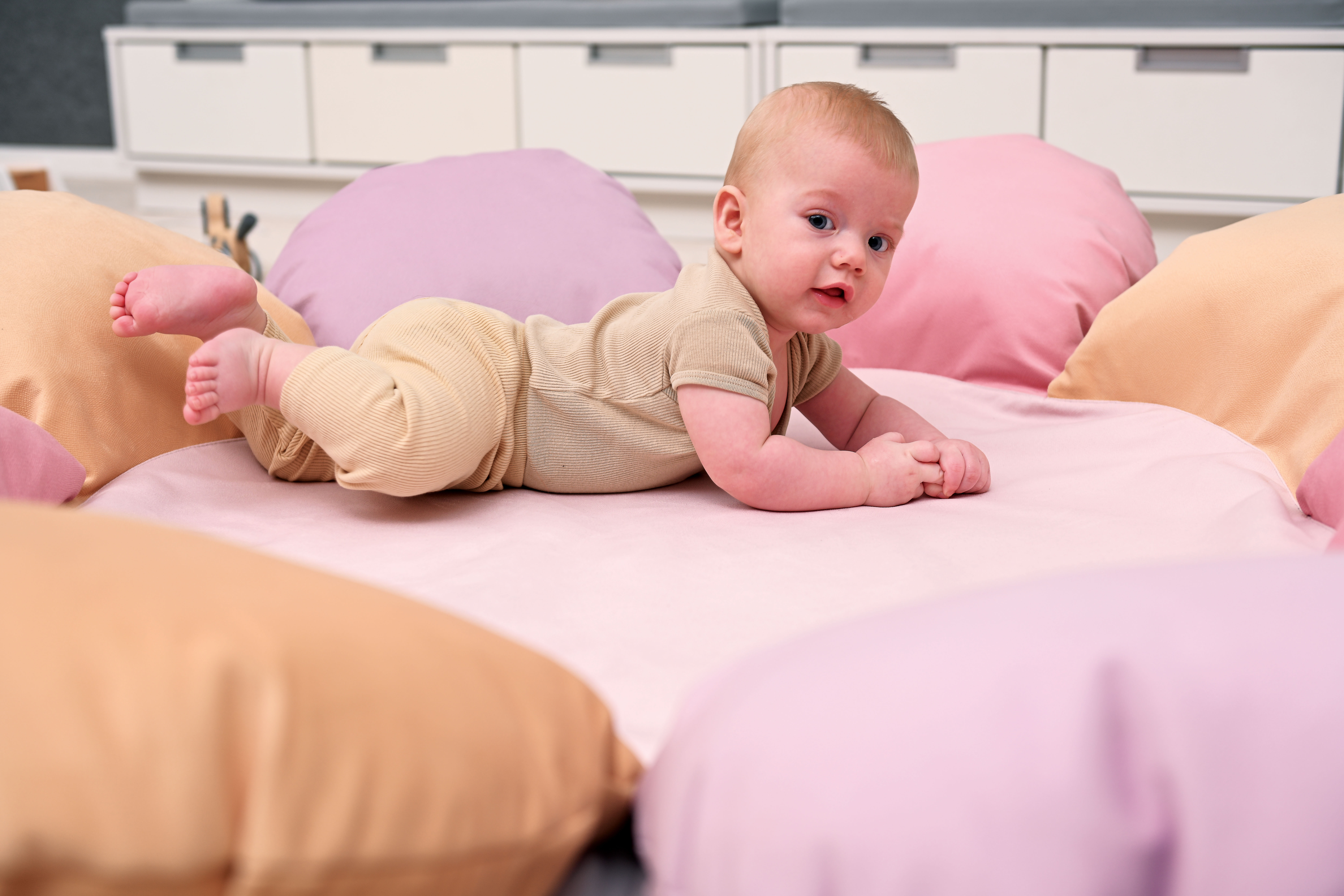 A szivacs és a puha henger alakú párna együtt, egy biztonságos és kényelmes eszközt alkot. A henger párna segít a gyerekeknek abban, amikor szeretnének felülni, és így könnyebben megtalálják az egyensúlyt. A kicsik így biztonságosabban és bátrabban mernek mozogni.