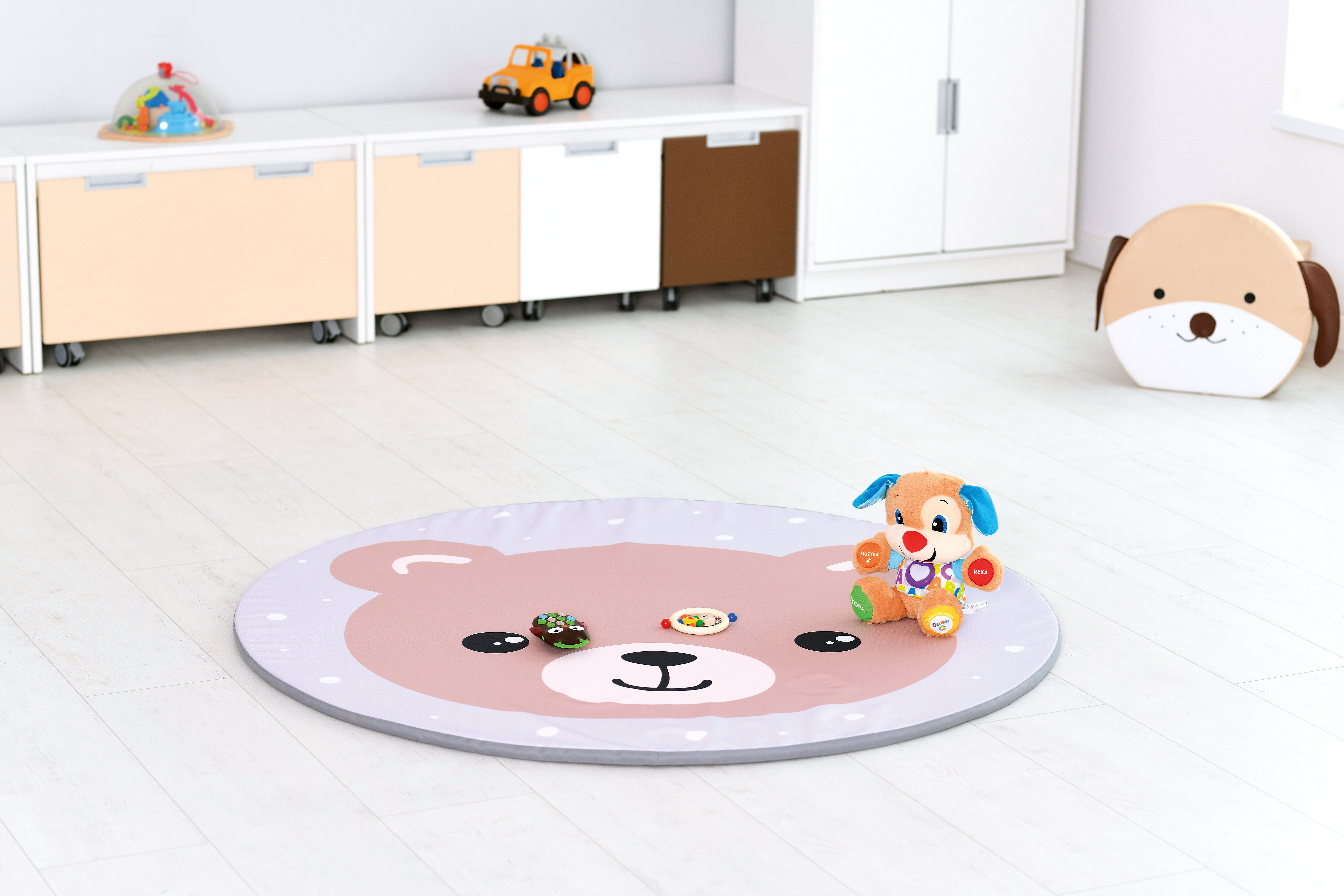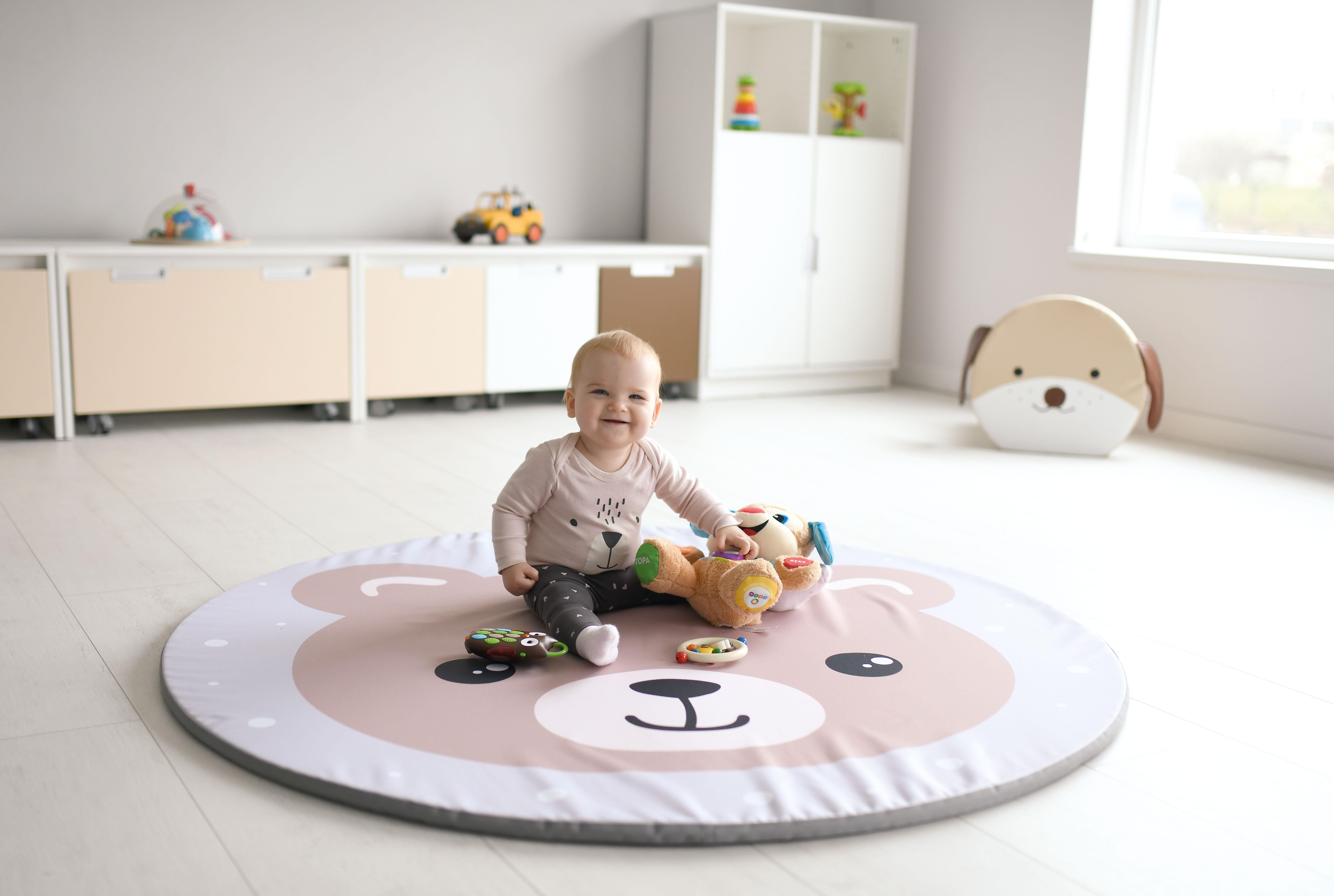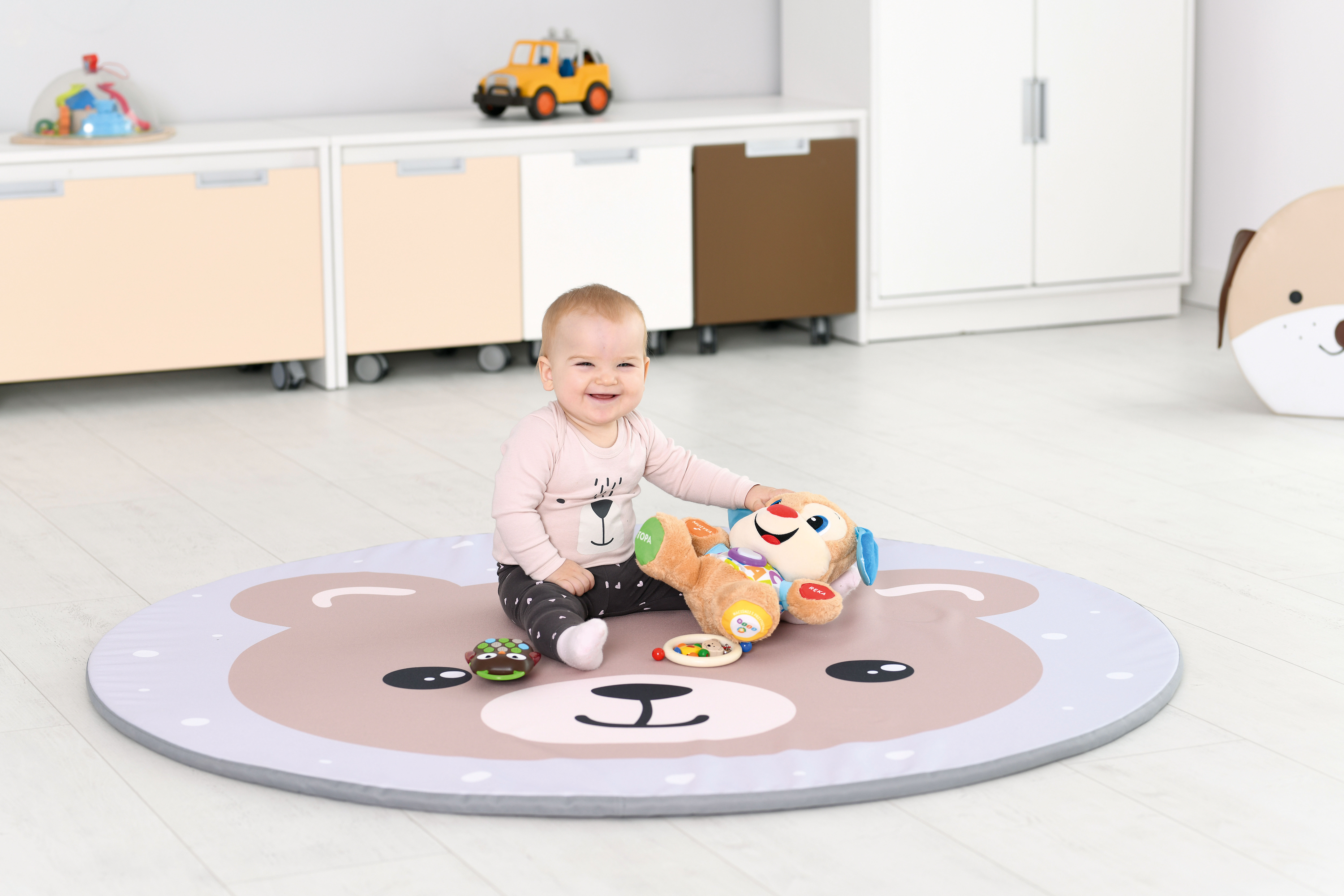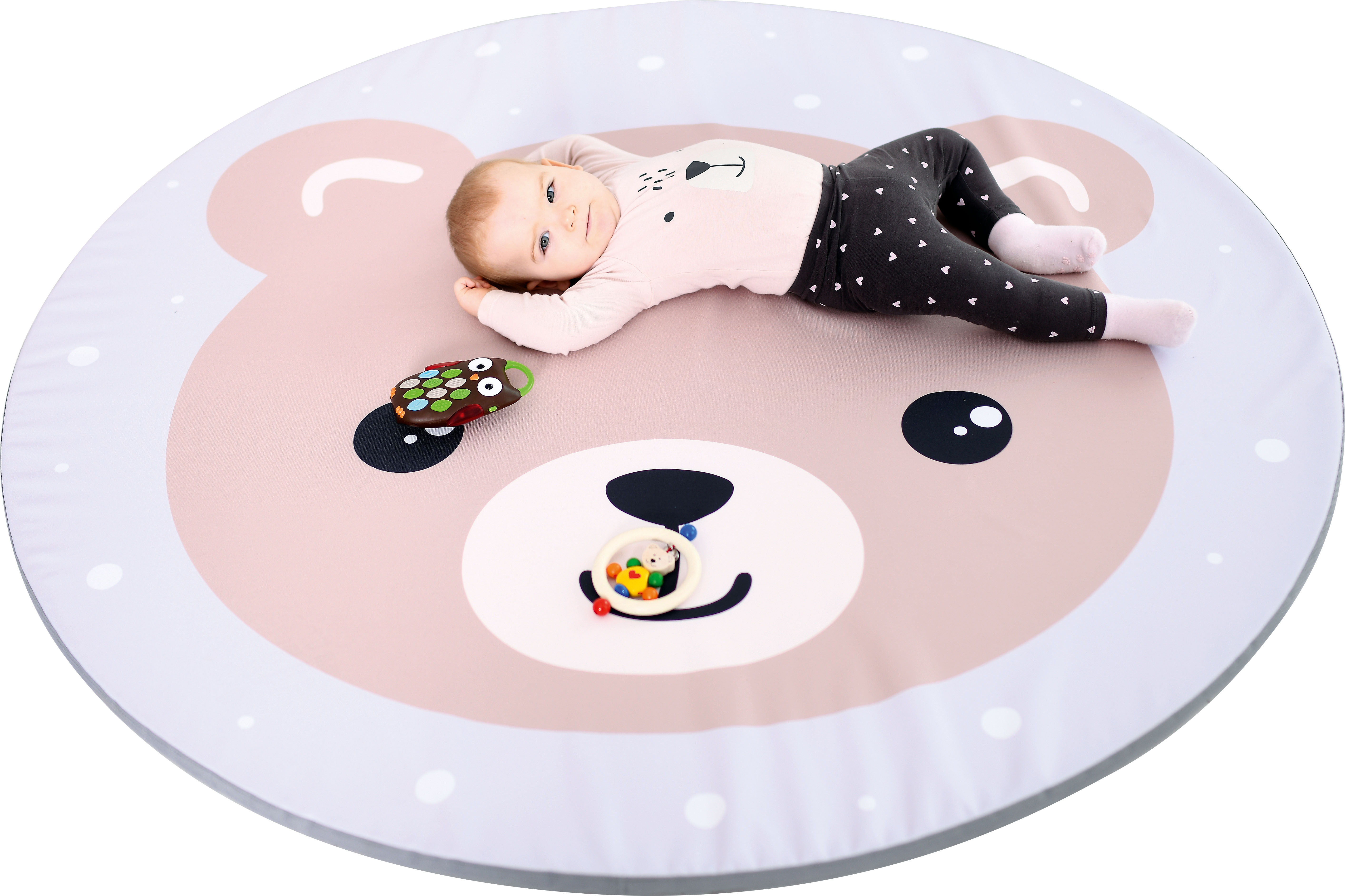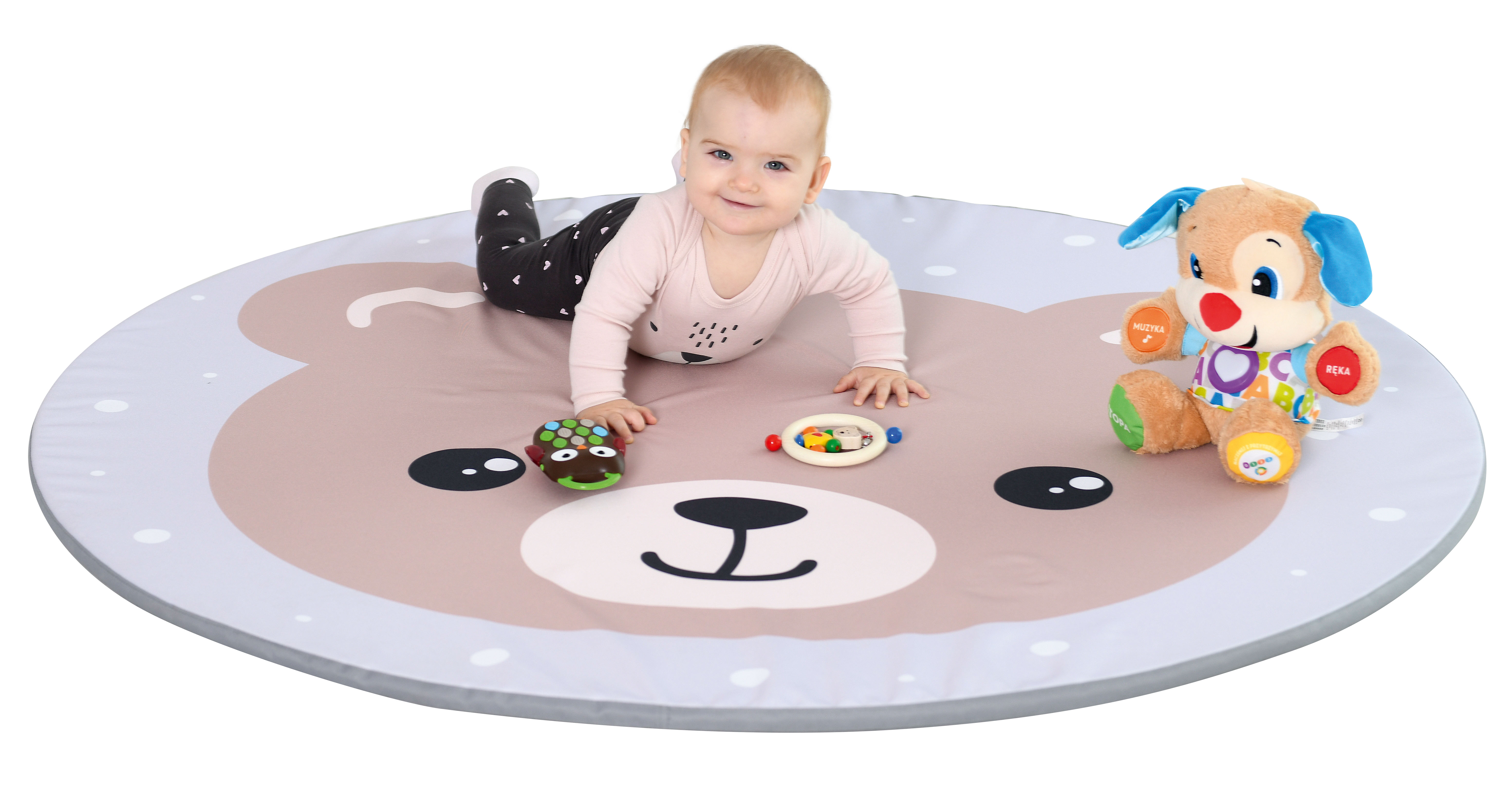A mosolygós macimintás, kör alakú matrac kontrasztos színeivel vonzza a babák figyelmét és fejlesztő hatással van a látásukra.