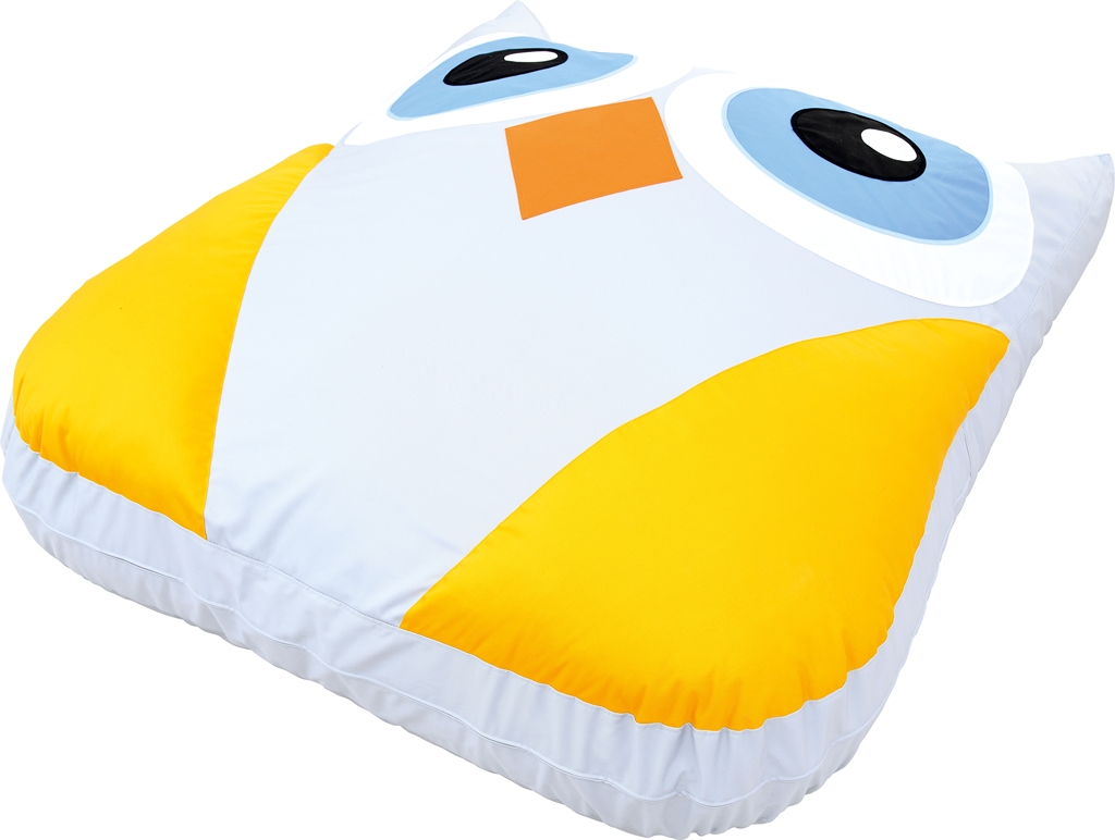 Az óriás bagoly mintájú és alakú padlópárna pasztell színekkel lett megalkotva. A bagoly teste világos szürke, szárnyai citromsárgák, csőre narancssárga, nagy szemei kékek, fehér szegéllyel. A párna formája lekerekített négyszög, füleinél háromszög alakú megnyújtással. A párna töltete habszivacs, huzata pamutszövet. A huzat lehúzható és mosható. Méretének köszönhetően több gyermek is biztonságosan és kényelmesen elfér rajta. Mérete: 147x180x20 cm.