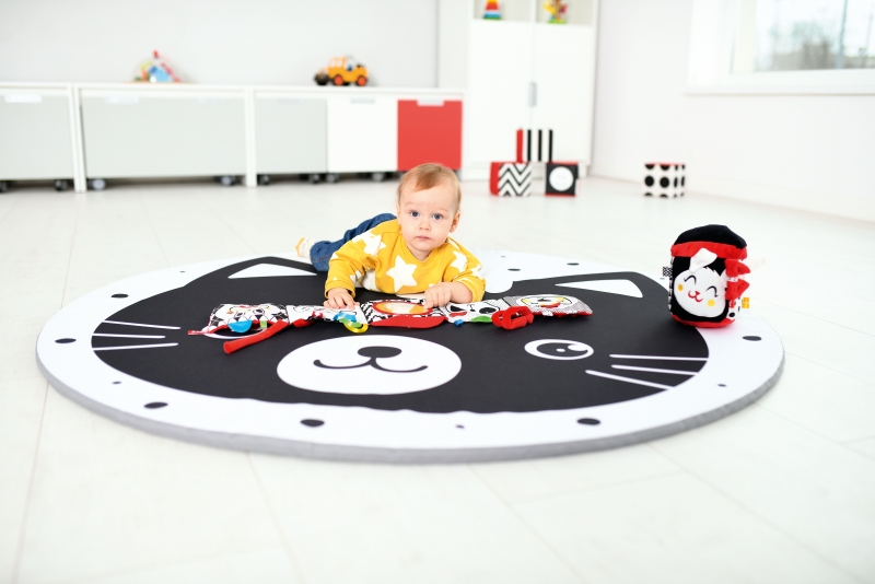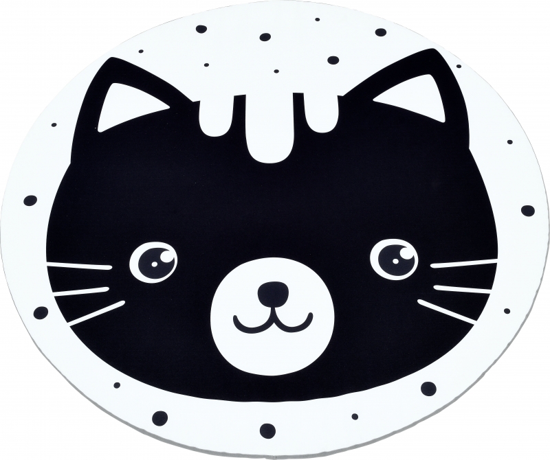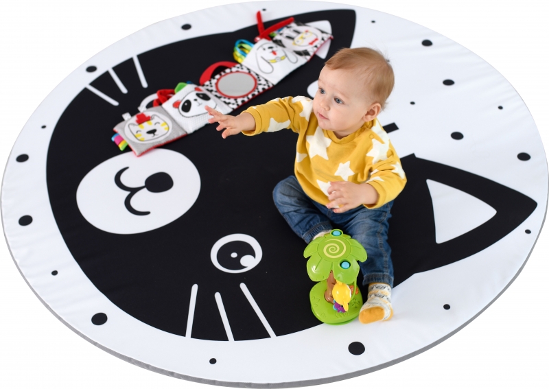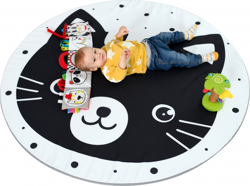 A mosolygós cica mintás kör alakú matrac kontrasztos színeivel vonzza a babák figyelmét, és fejlesztő hatással van a látásukra.