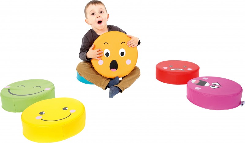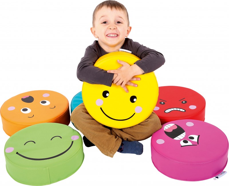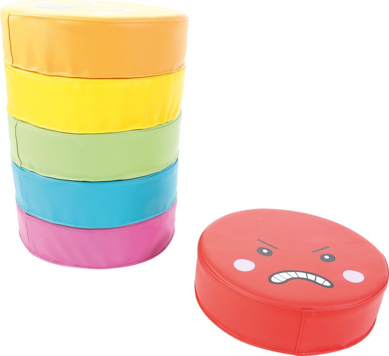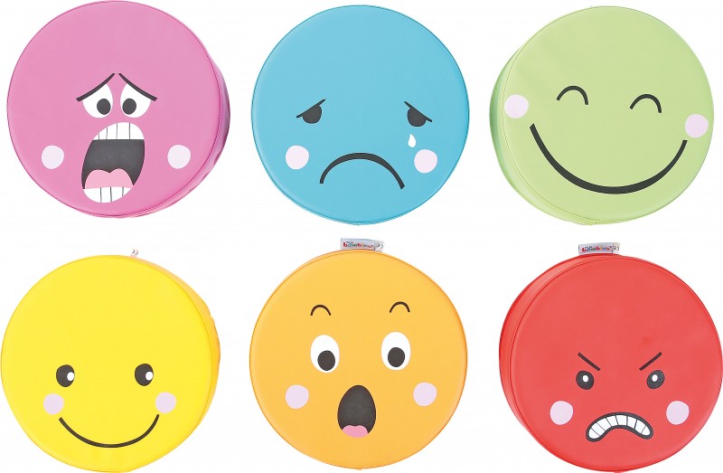 Az érzelmek padlópárna készlete 6 különböző párnát tartalmaz. A párnák közt megtalálható a boldogság, a szomorúság, a harag, a meglepettség, az elégedettség és a félelem érzelmét tükröző arckifejezés. Mindegyik más-más színnel van jelölve. A félelem a lila, a szomorúság a kék, a boldogság a zöld, az elégedettség a citromsárga, a meglepettség a narancssárga, a harag pedig a piros színt viseli. A párnák kör alakú, műbőrrel bevont szivacs párnák. Átmérőjük: 30 cm, magasságuk: 8 cm. 6 hónapos korú gyermekek használatára CE minősítéssel ellátva!