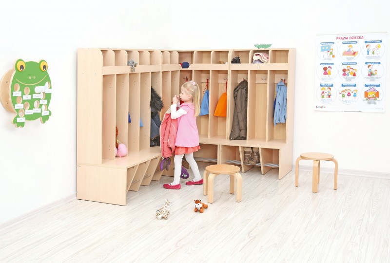 Elegáns és többfunkciós gyerekszekrény, amely polcokkal, rekeszekkel és akasztókkal van ellátva. Alul cipőtartó található. Az öltözőhöz külön vásárolhatóak színes ajtók többféle színvariációban. Lehet csoportonként is színt választani, de akár a tarkabarka színösszeállítás is jól mutat. Mérete: 80x80x131 cm Ülésmagasság: 32,5 cm A termék lapraszerelt. Anyaga: laminált bútorlap
