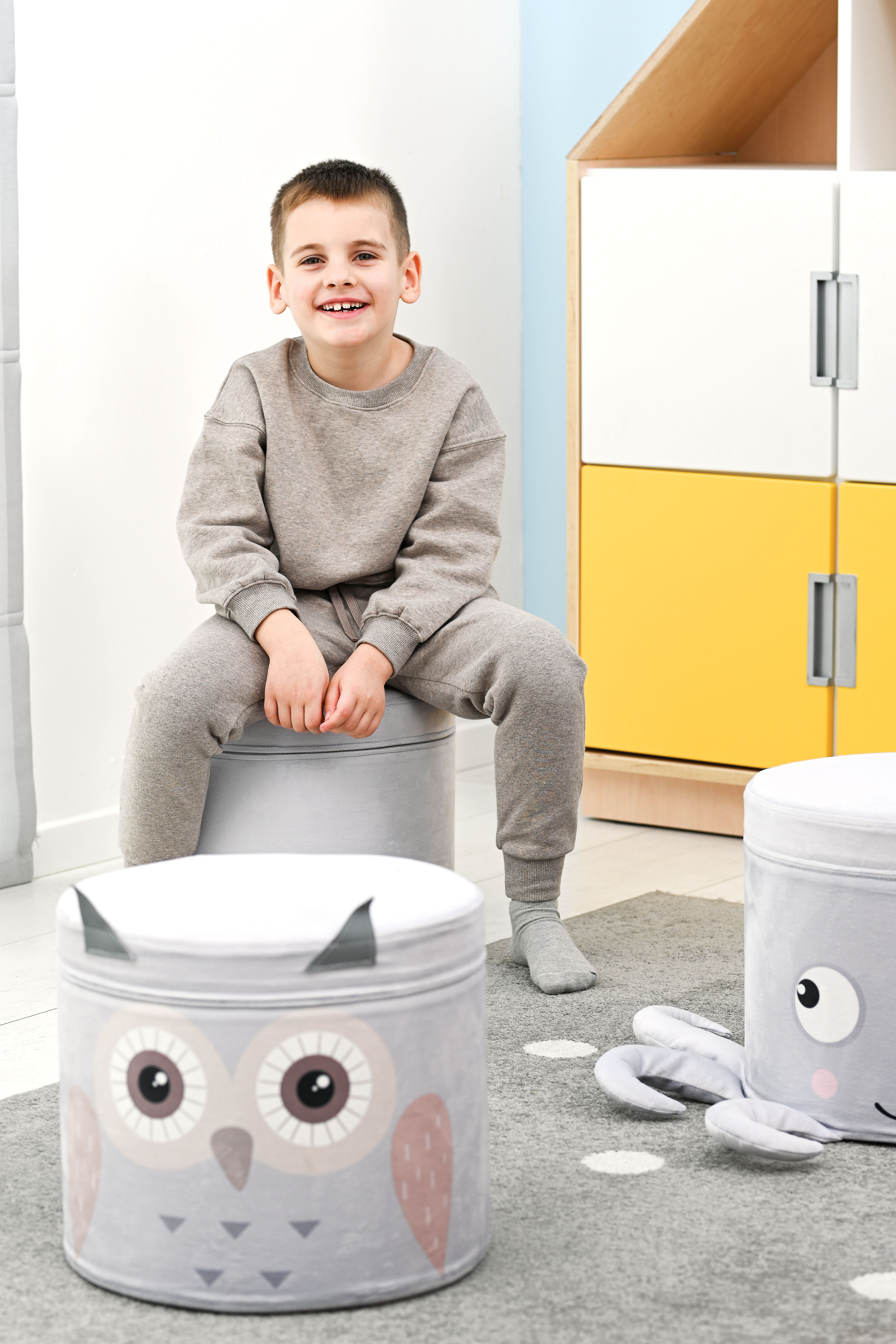 Bagoly puff pasztell - Mérete: magasság: 30 cm, átmérő: 35 cm - Leírás: Puha, állat formájú puff, levehető és mosható huzattal, amely ülésre, pihenésre és játékra is alkalmas. - Fejlesztési terület: nagymozgás, koordináció, testtudat, térbeli tájékozódás