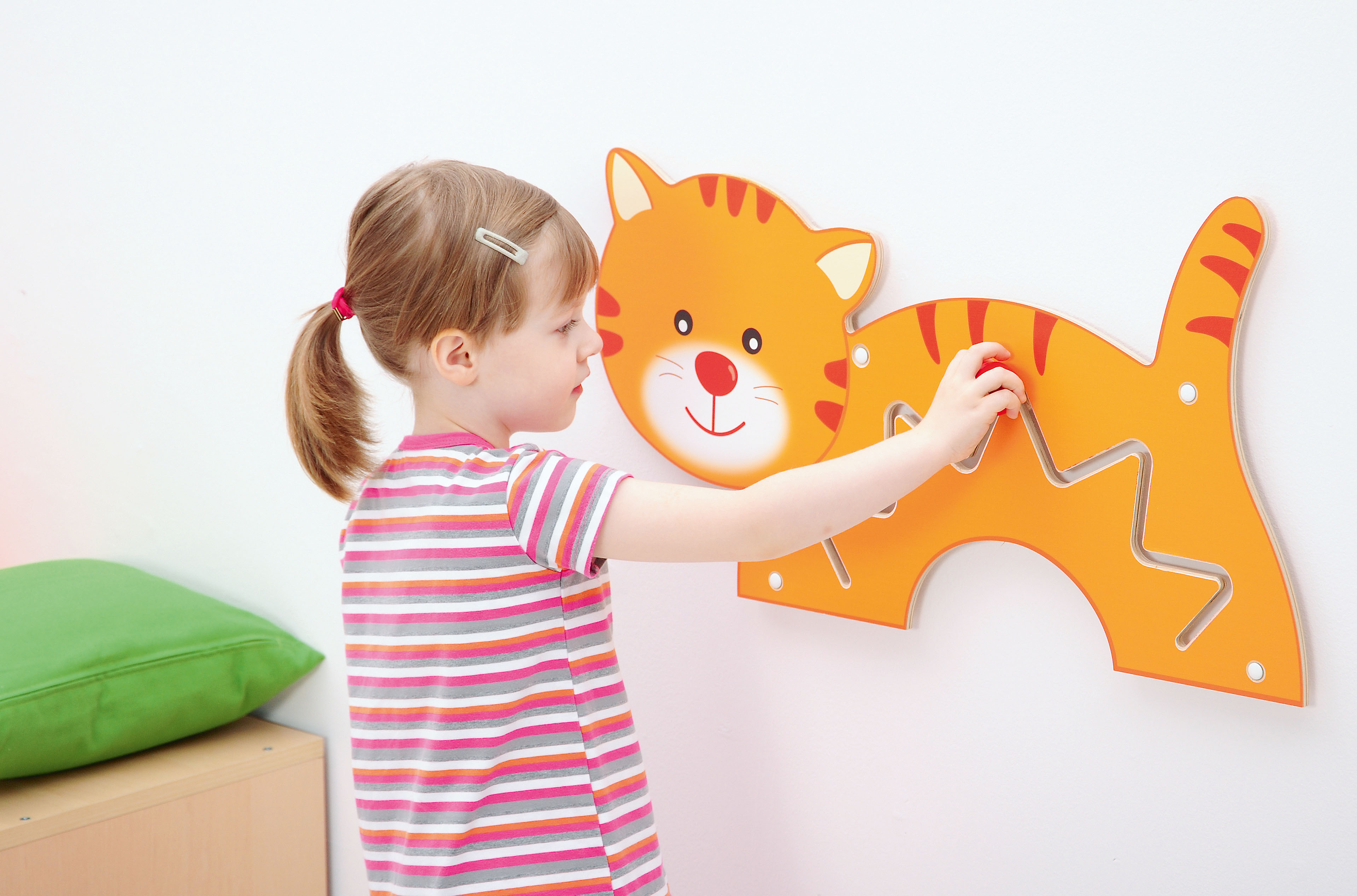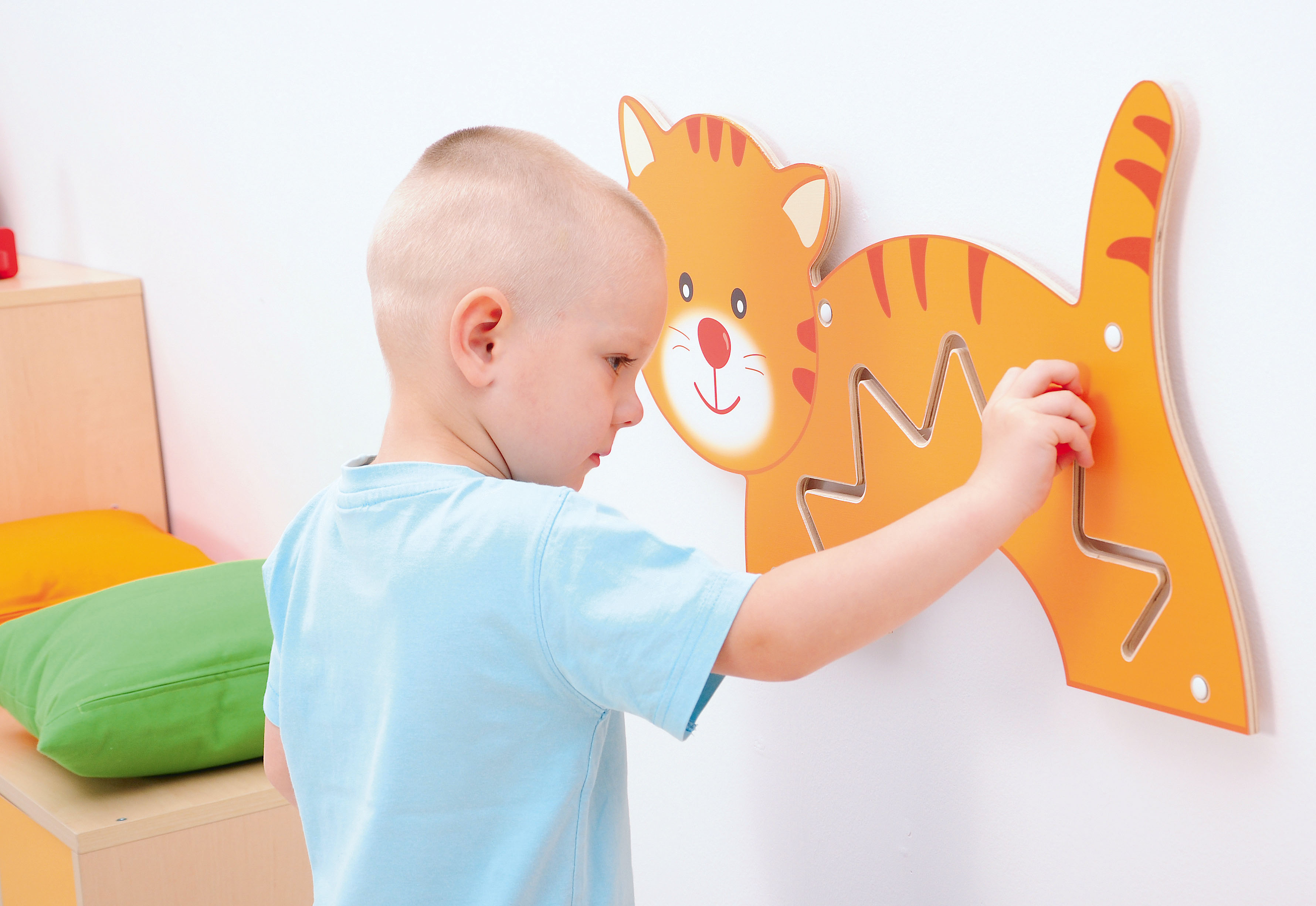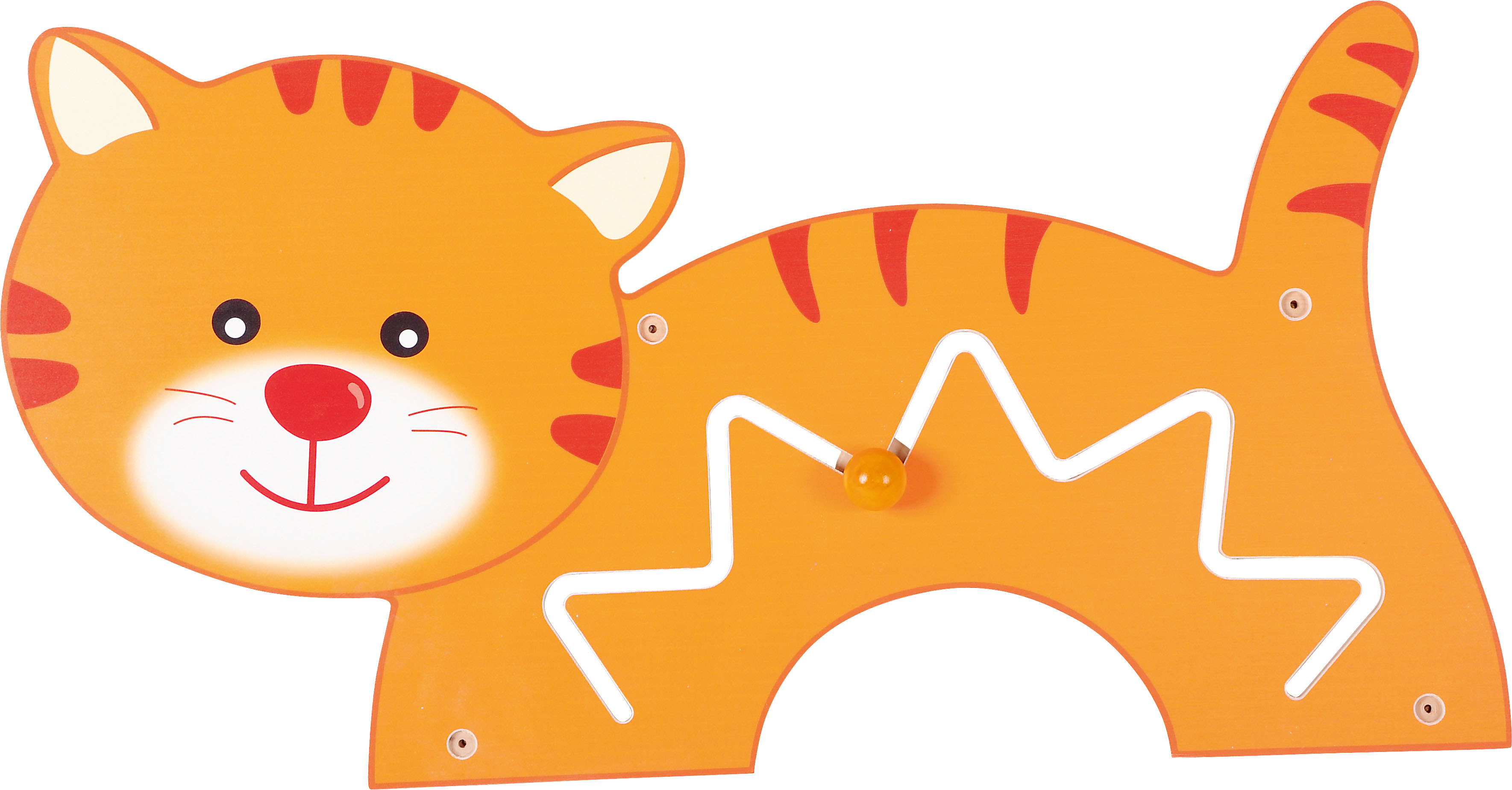 Termék mérete: 70x35 cm Anyaga: MDF bútorlap A falra szerelhető kedves kis cicát ábrázoló vonalvezető vidám és színes megjelenésével nem csupán a dekorációért felel, hanem készségfejlesztő feladatokat is lehet vele végezni. A fali vonalvezetők lehetőséget biztosítanak a gyerekeknek arra, hogy a nagymozgások gyakorlása által megalapozódjanak az iskolaérettséghez fontos finommotorikus készségeik, összehangolódjon a szem-kéz koordinációjuk. A számos lehetőséget kínáló játék változatos feladatokat kínál. Használatával fejleszthető a figyelem, a koncentráció, az ok-okozati összefüggések felismerésének lehetősége. Esztétikus formája, kellemes színvilága egyaránt ösztönzően hat a legkisebbekre, az óvodás- és az iskoláskorú gyermekekre egyaránt. A falra fogatása az egységcsomagban érkező csavarral és dübellel lehetséges.