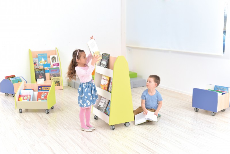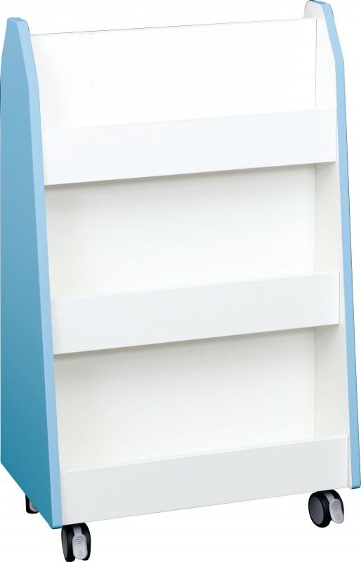 A bútorlapból készült gurulós könyvespolc mérete gyerekek magasságához lett kialakítva. A polc háromszögletes kialakítása lehetővé teszi, hogy mind a két oldalára lehessen könyveket vagy játékokat tenni. Oldalanként 3-3 tárolópolc található rajta. Alján lévő 4 kereke segít a könnyed mozgathatóságban. A polc két oldalsó lapja kék színű, a test és a polcok előlapjai fehérek. A polc színes MDF bútorlapból és 1,8 cm-es laminált bútorlapból készül. Mérete: 90x38x98 cm, mélysége: 8/10/14 cm Lapraszerelt termék.